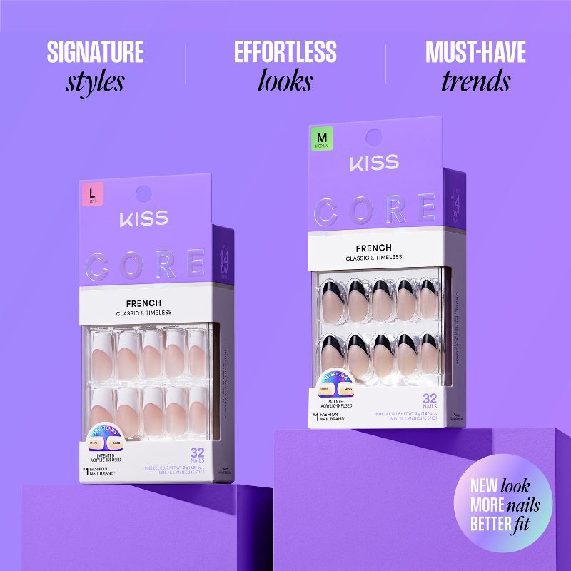 NEW Look. MORE Nails. BETTER Fit! Keep it classic in Kiss CORE French Press On Nails. These nails feature patented, chip-free, acrylic-infused technology that ensures long-lasting color and durable we…