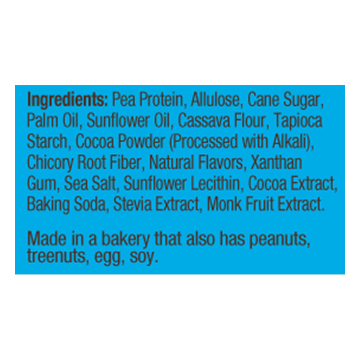 Palm Fruit Oil, Allulose, Pea Protein, Cane Sugar, Cassava Flour, Chicory Root Fiber, Tapioca Starch, Dutch Cocoa Powder, Xanthan Gum, Natural Flavor, Sea Salt, Baking Soda, Sunflower Lecithin, Stevia…