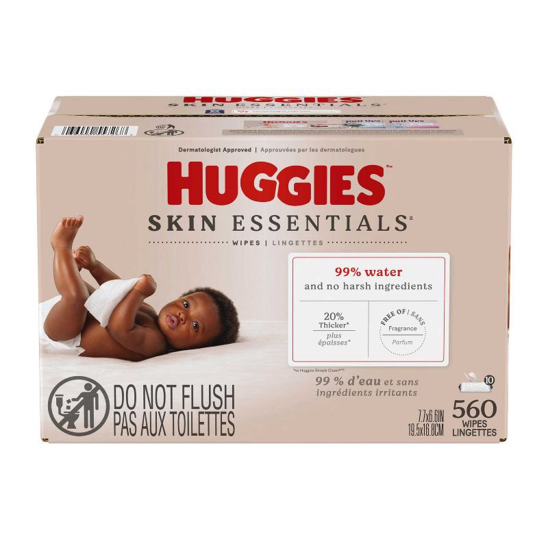 - 10 Flip Top Packs of 56 Huggies Skin Essentials Baby Wipes, Hypoallergenic, 99% Pure Water, 560 Count