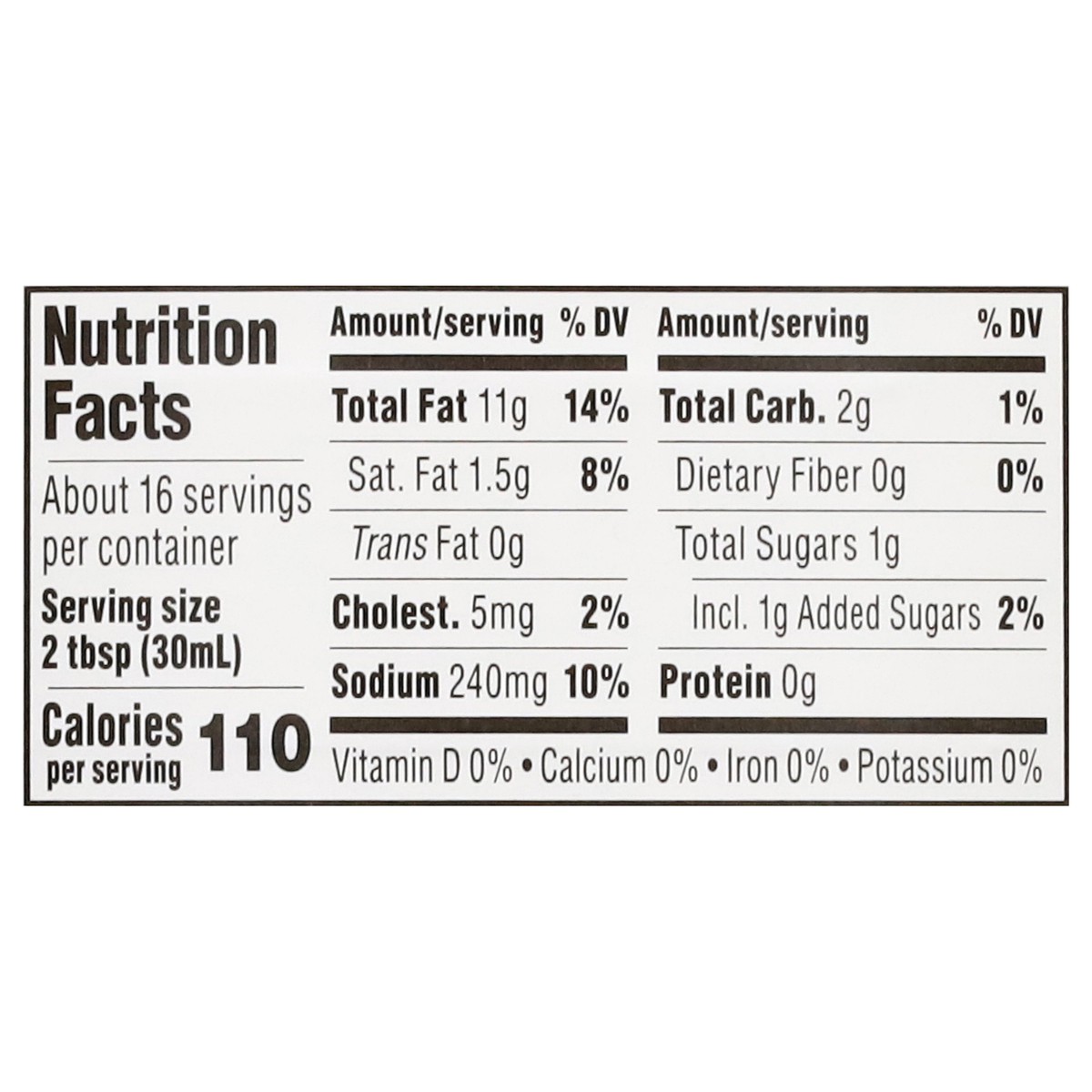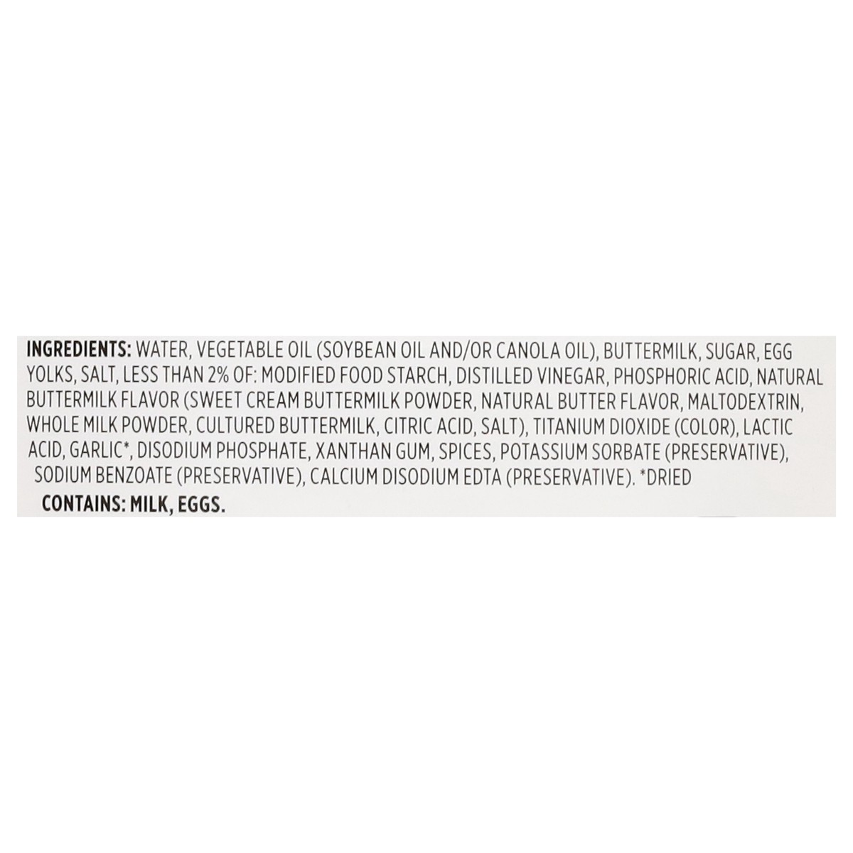 Water, Vegetable Oil (Soybean Oil and/or Canola Oil), Buttermilk, Sugar, Egg Yolks, Salt, Less than 2% of: Modified Food Starch, Distilled Vinegar, Phosphoric Acid, Natural Buttermilk Flavor (Sweet Cr…