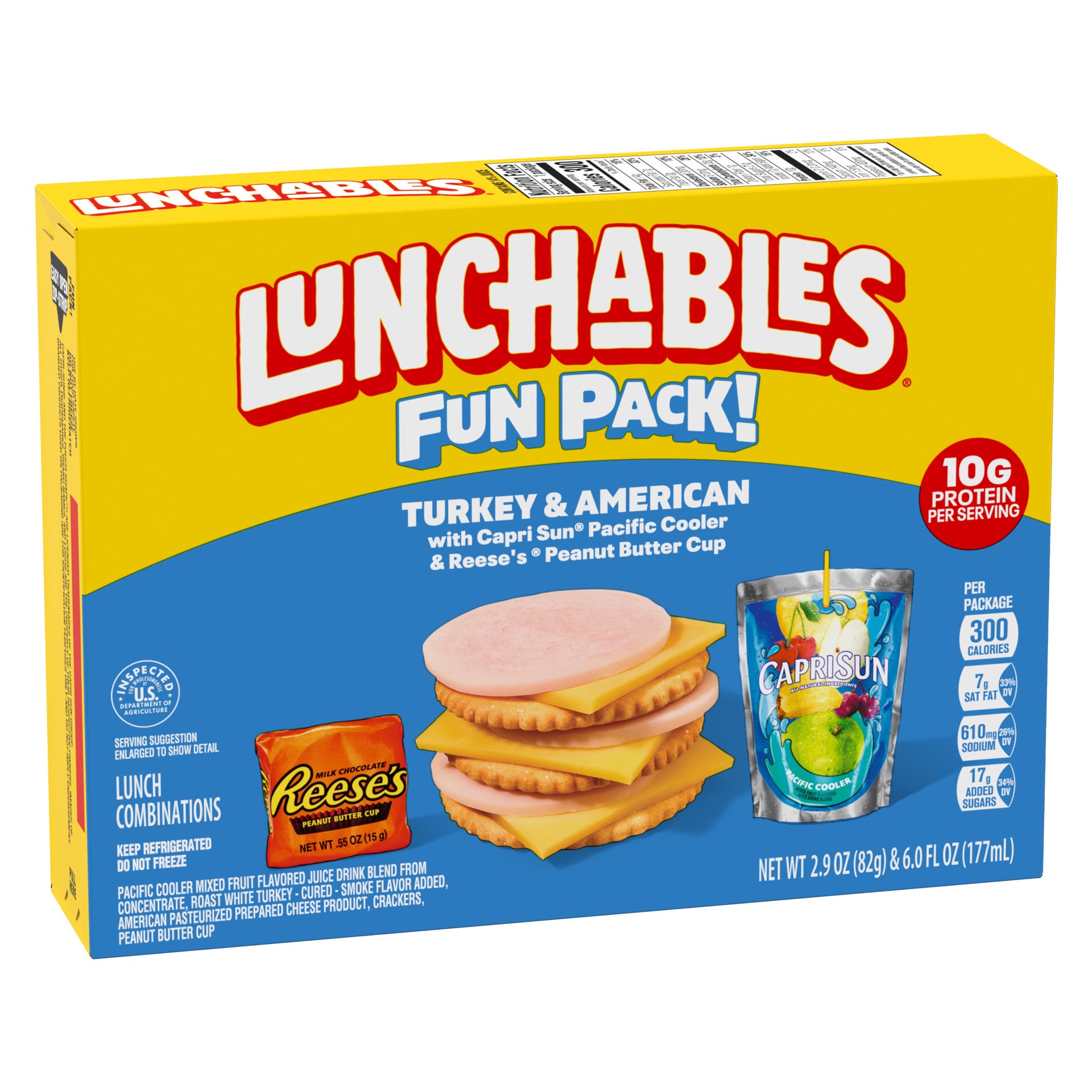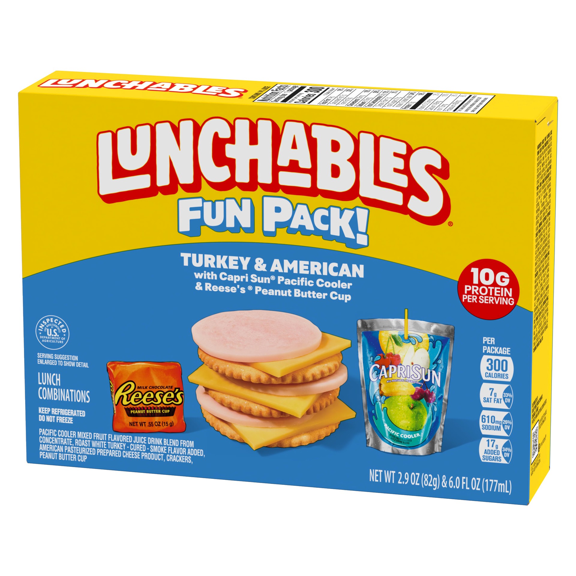 Have fun with lunch! Lunchables Turkey & American with Capri Sun Pacific Cooler and Reese's Peanut Butter Cup Fun Pack! lets kids eat it their way — no prep needed! Each 2.9 ounce tray contains cured …