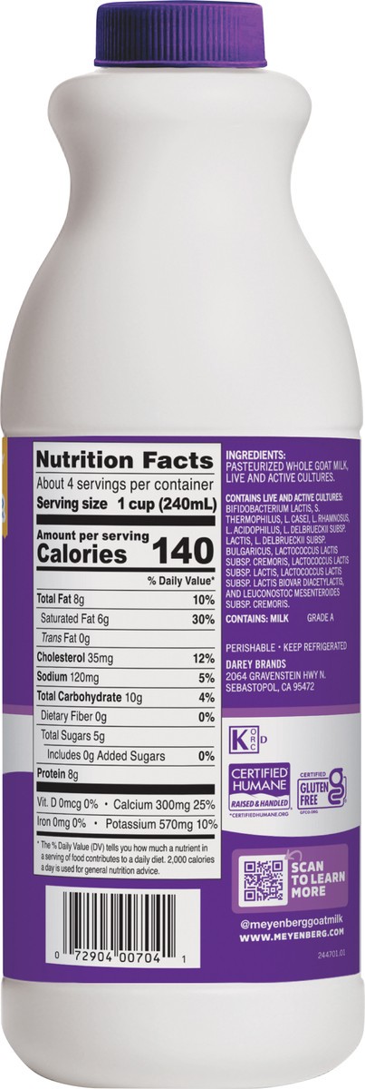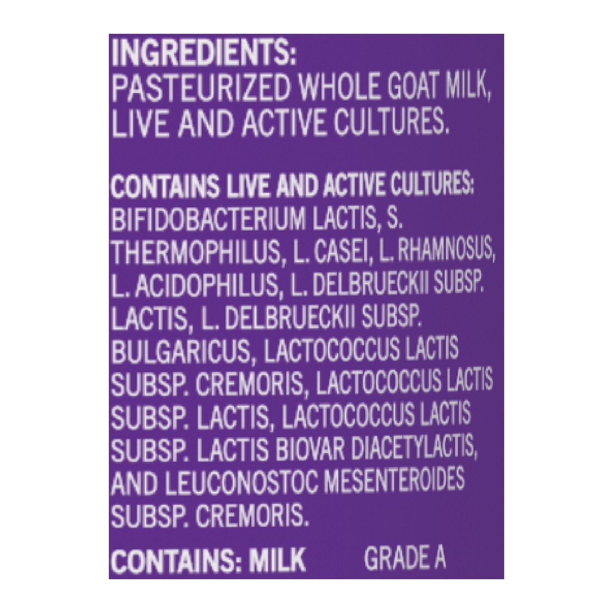 Pasteurized Whole Goat Milk, Live and Active Cultures. Contains Live and Active Cultures: Bifidobacterium Lactis, S. Thermophilus, L. Casei, L, Rhamnosus, L. Acidophilus, L, Delbrueckii Subsp, Lactis,…