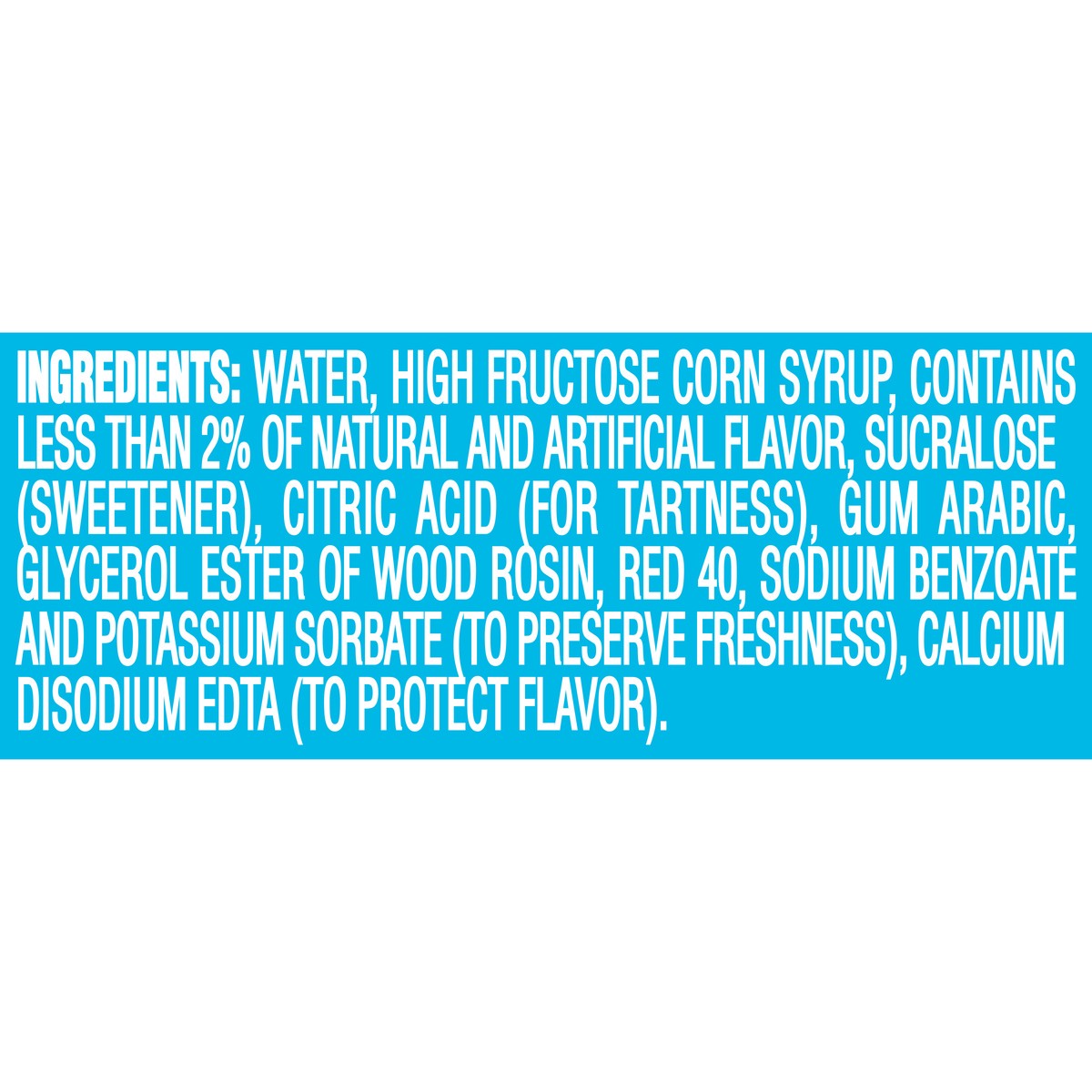 WATER, HIGH FRUCTOSE CORN SYRUP, CONTAINS LESS THAN 2% OF NATURAL AND ARTIFICIAL FLAVOR, SUCRALOSE (SWEETENER), CITRIC ACID (FOR TARTNESS), GUM ARABIC, GLYCEROL ESTER OF WOOD ROSIN, RED 40, SODIUM BEN…