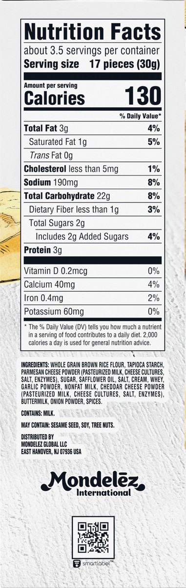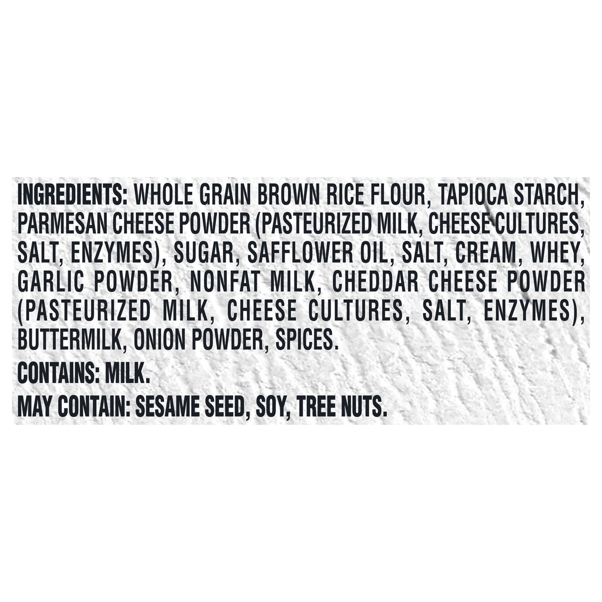 INGREDIENTS: WHOLE GRAIN BROWN RICE FLOUR, TAPIOCA STARCH, PARMESAN CHEESE POWDER (PASTEURIZED MILK, CHEESE CULTURES, SALT, ENZYMES), SUGAR, SAFFLOWER OIL, SALT, CREAM, WHEY, GARLIC POWDER, NONFAT MIL…