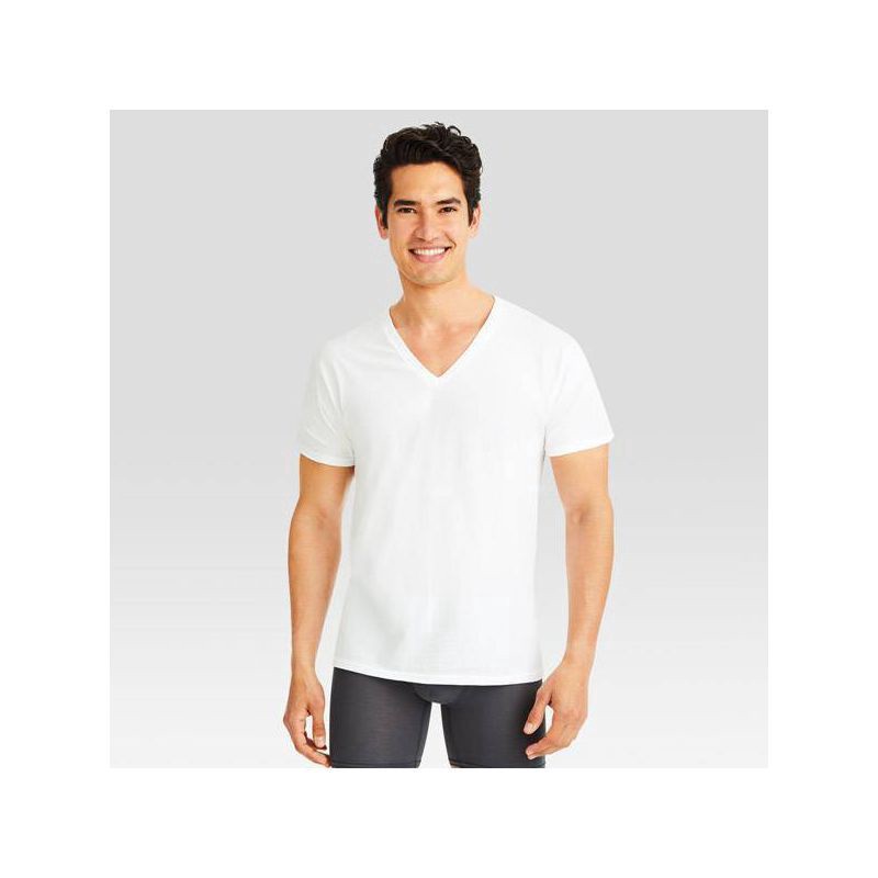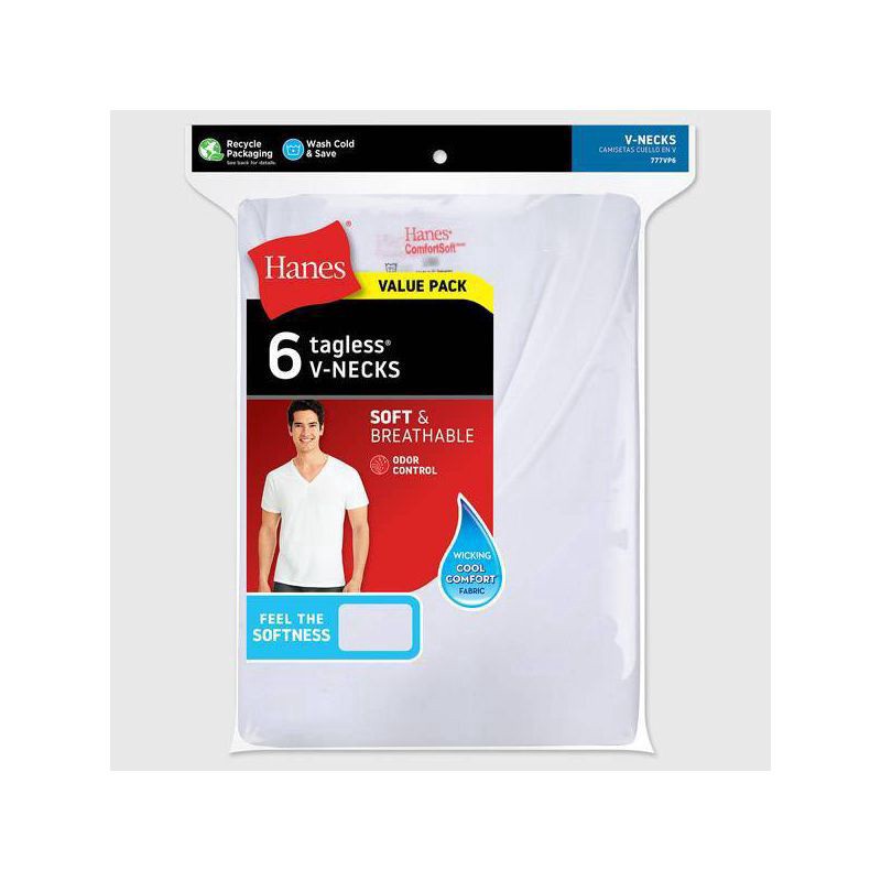 Hanes Men's White V-neck Tees are available in a convenient pack of 6. With super soft ComfortSoft fabric, these tees offer everyday, all day comfort from the brand you trust. FreshIQ advanced odor pr…