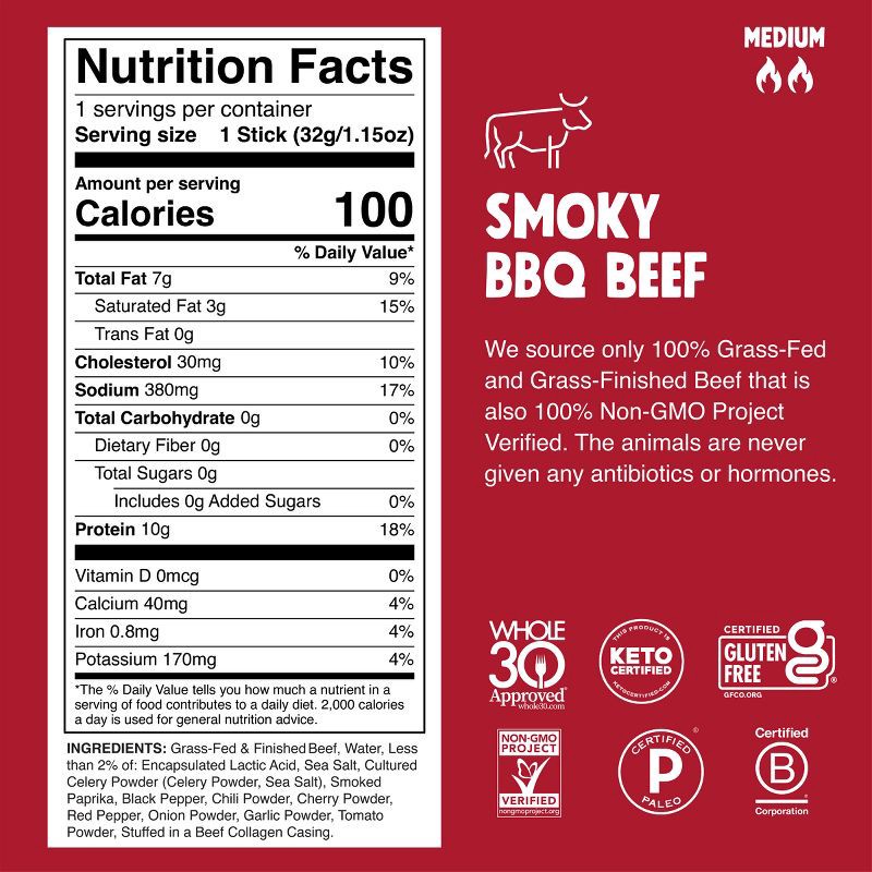 - Total Snackage: each satisfying 1.15 oz Smoky BBQ Beef jerky snack stick is made with high quality, real ingredients, has 10 grams of protein, zero sugar, and just 100 calories