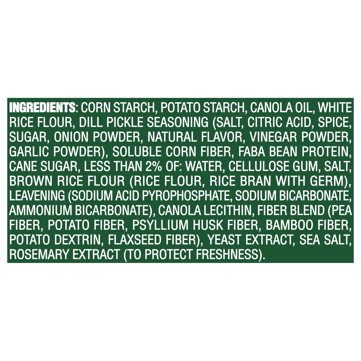 Corn Starch, Potato Starch, Canola Oil, White Rice Flour, Dill Pickle Seasoning (Salt, Citric Acid, Spice, Sugar, Onion Powder, Natural Flavor, Vinegar Powder, Garlic Powder), Soluble Corn Fiber, Faba…