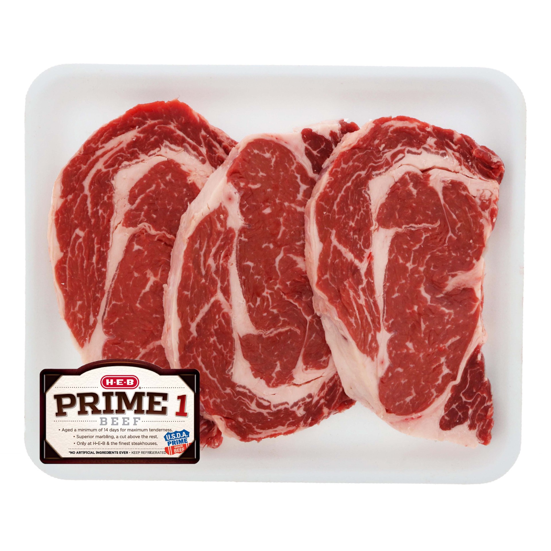 Full of rich, beefy taste, our H-E-B Prime 1 beef ribeye steaks have abundant marbling for lots of juiciness. Aged for a minimum of 14 days for maximum tenderness, they're easy to grill or pan-sear. G…