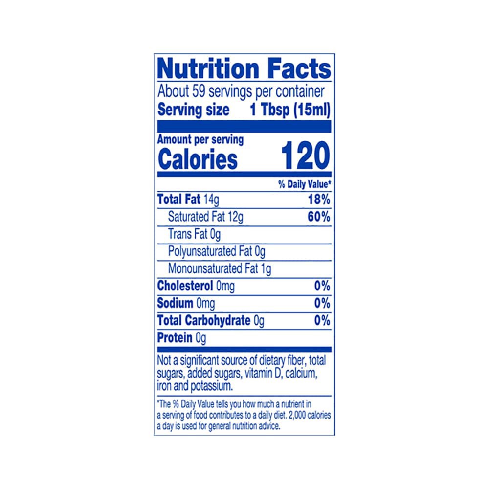 Great for Baking & Sautéing!No Artficial Flavors or PreservativesKosherVeganAbout 60 Servings120 Calories, 13g Sat Fat, 0mg Sodium, 0g Sugars per 1 Tablespoon
