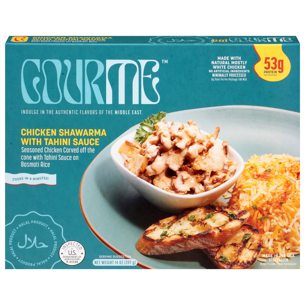 Rice: Basmati Rice, Beef Bone Broth (Water, Beef Bone, Celery, Carrot, Garlic, Cinnamon Sticks, Onions, Black Pepper, Apple Cider), Corn Oil, Salt, Saffron Chicken Shawarma: Chicken Breast Meat, Chickā¦