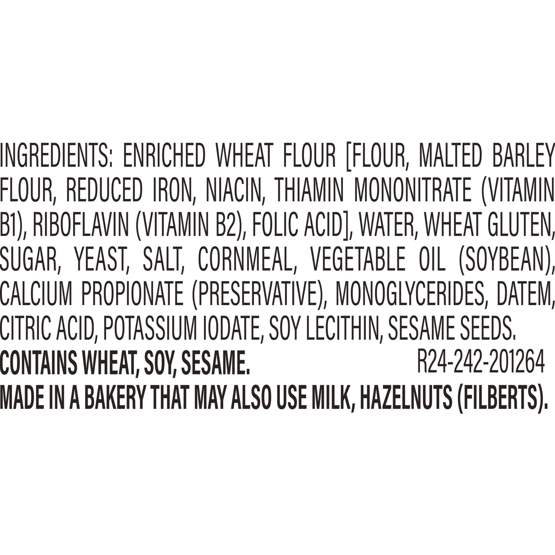 Enriched Wheat Flour [Flour, Malted Barley Flour, Reduced Iron, Niacin, Thiamin Mononitrate (Vitamin B1), Riboflavin (Vitamin B2), Folic Acid], Water, Wheat Gluten, Sugar, Yeast, Salt, Cornmeal, Veget…