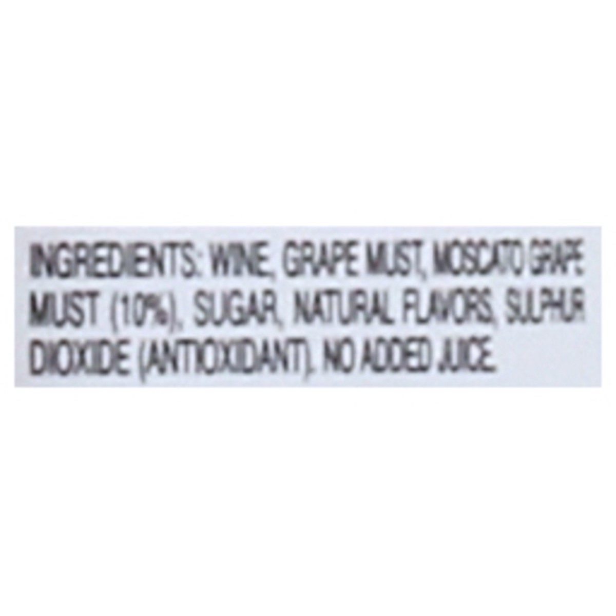 Wine, Water, Grape Must, Moscato Grape Must (10%), Sugar, Natural Flavors, Sulphur Dioxide (Antioxidant), No Added Juice.