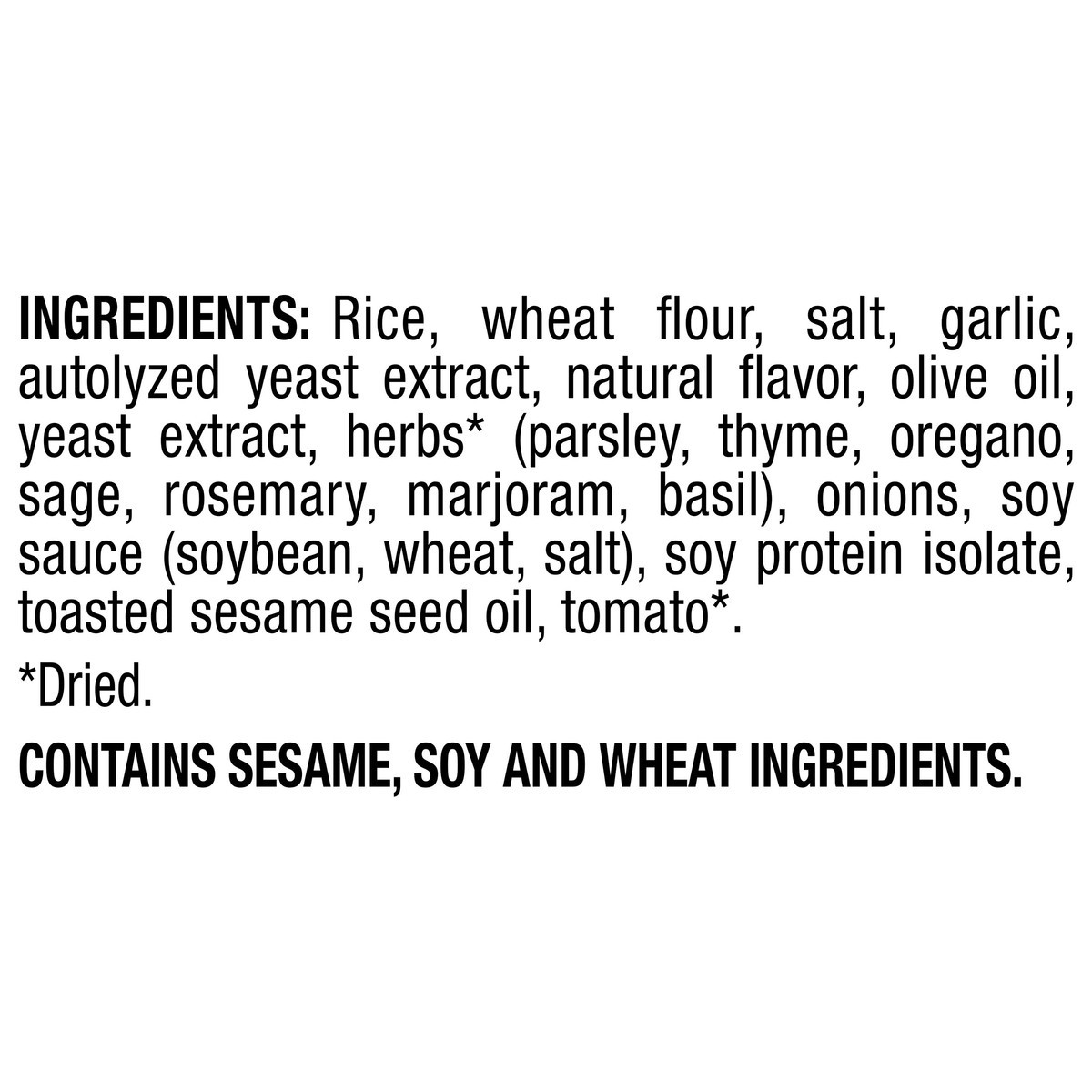 Rice, Wheat Flour, Salt, Garlic, Autolyzed Yeast Extract, Natural Flavor, Olive Oil, Yeast Extract, Herbs* (Parsley, Thyme, Oregano, Sage, Rosemary, Marjoram, Basil), Onions, Soy Sauce (Soybean, Wheat…