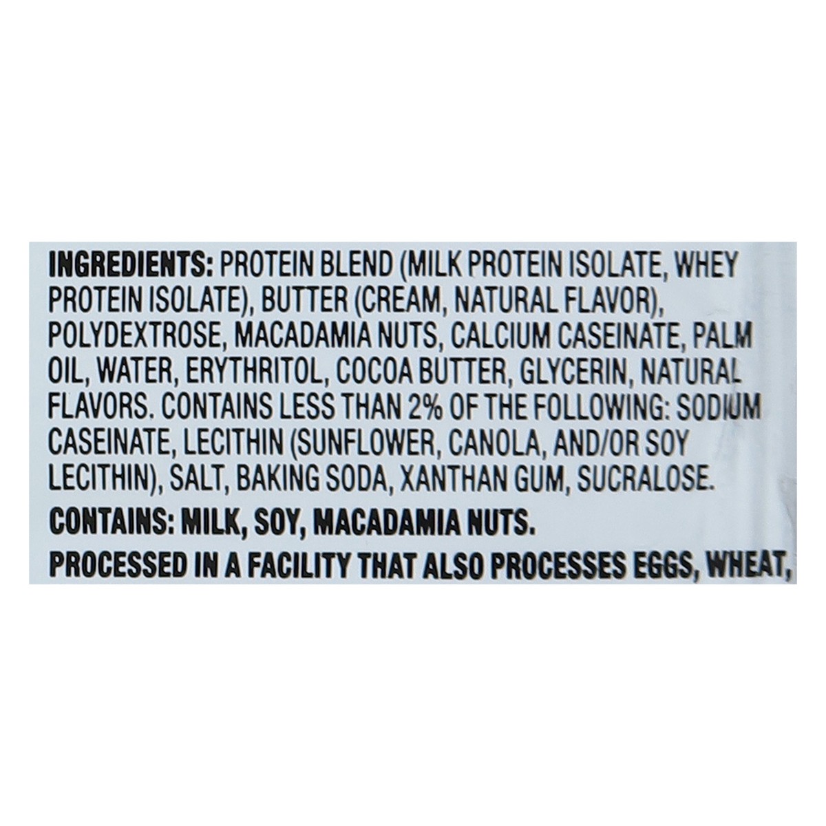 Protein Blend (Milk Protein Isolate, Whey Protein Isolate), Butter (Cream, Natural Flavor), Polydextrose, Macadamia Nuts, Calcium Caseinate, Palm Oil, Water, Erythritol, Cocoa Butter, Glycerin, Natura…