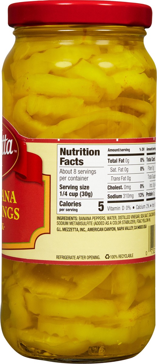Banana Peppers, Water, Distilled Vinegar, Sea Salt, Calcium Chloride, Natural Flavors, Sodium Metabisulfite (Added as a Color Stabilizer), FD&C Yellow 5.
