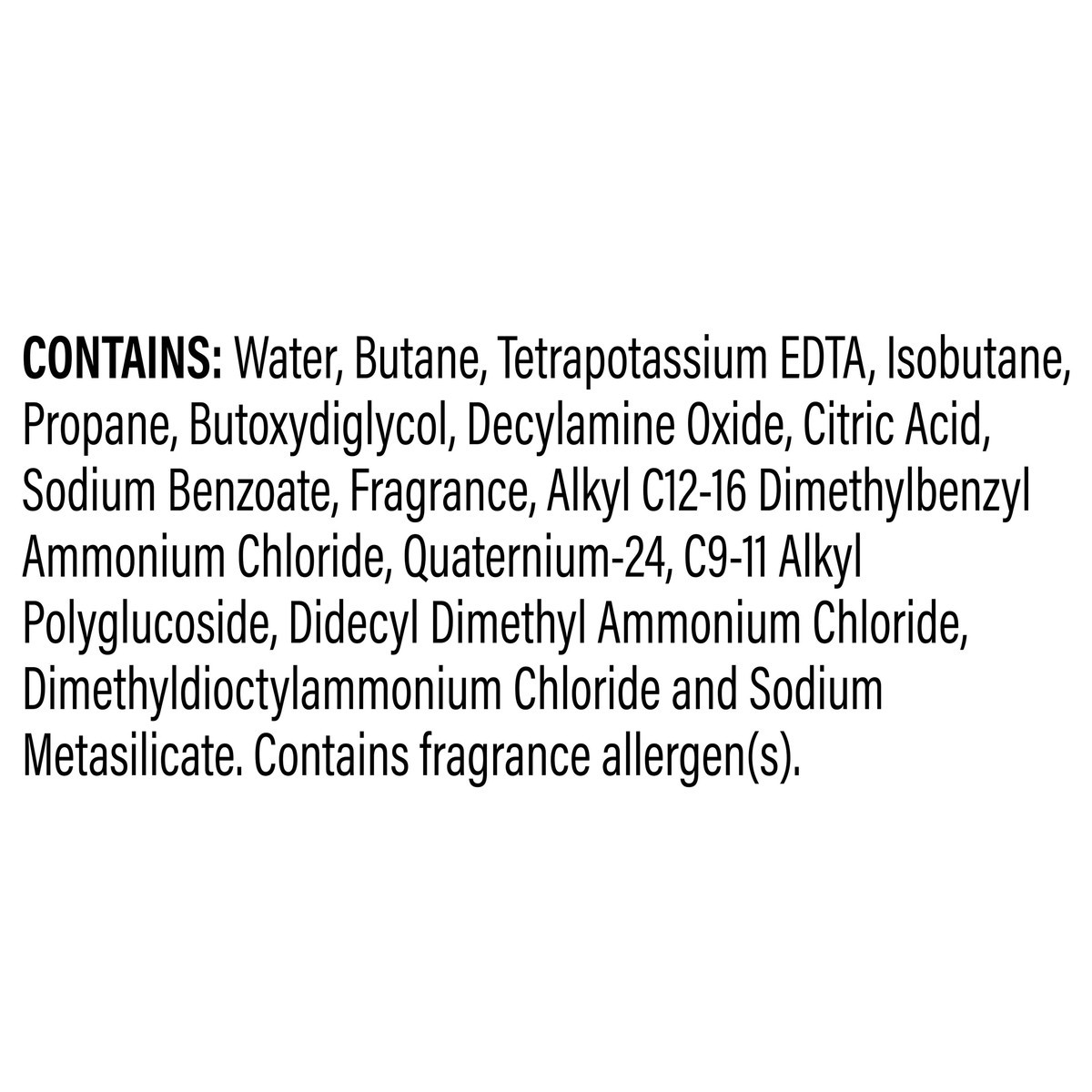 Contains: Water, Butane, Tetrapotassium EDTA, Isobutane Propane, Butoxydiglycol, Decylamine Oxide, Citric Acid, Sodium Benzoate, Fragrance, Alkyl C12-16 Dimethylbenzyl Ammonium Chloride, Quaternium-24…
