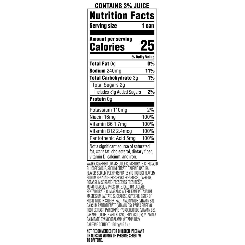 Water, Clarified Orange Juice Concentrate, Citric Acid, Glucose Syrup, Sodium Citrate, Taurine, Natural Flavor, Sodium Polyphosphates (to Protect Flavor), Sodium Benzoate (Preserves Freshness), Caffei…