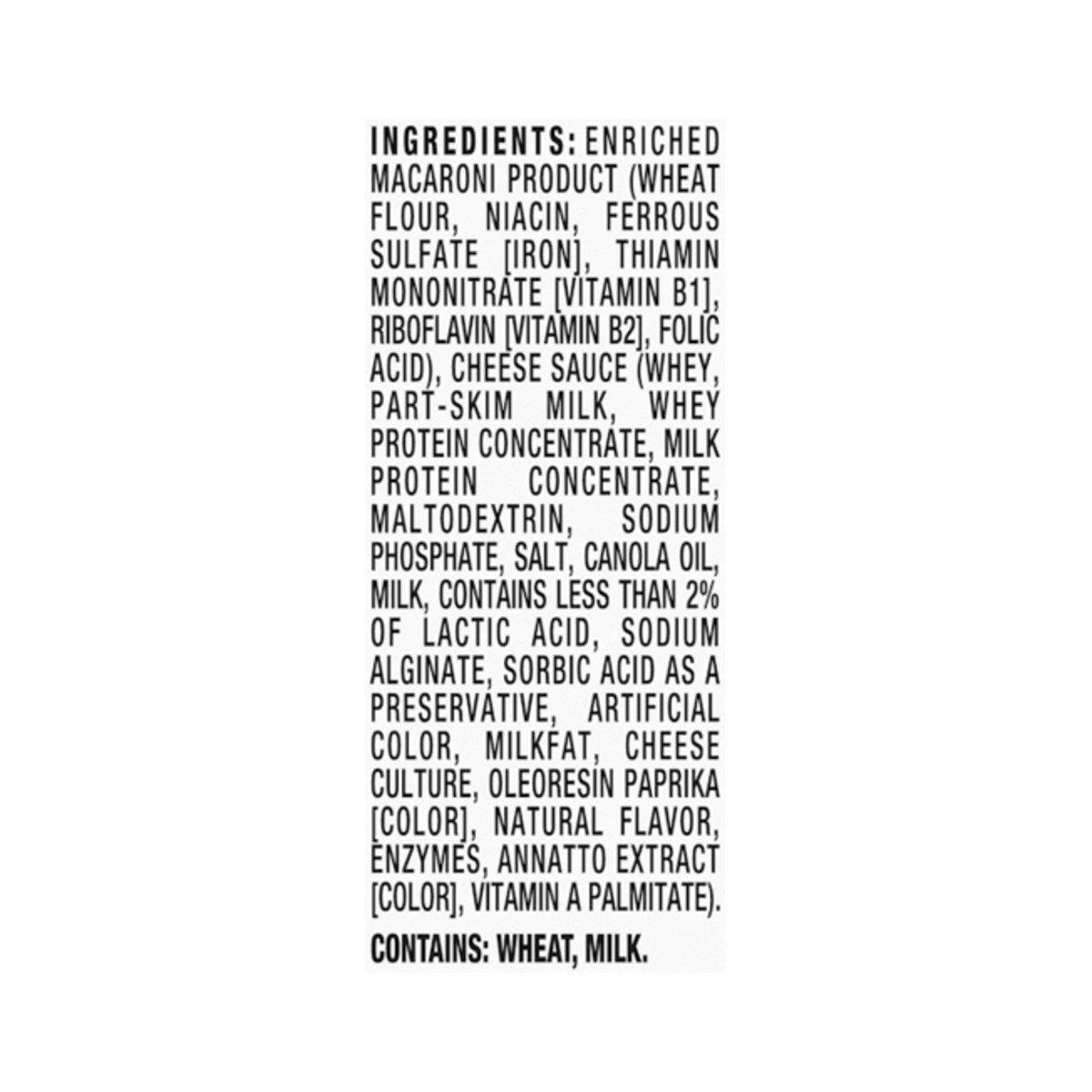 Enriched Macaroni Product (Wheat Flour, Niacin, Ferrous Sulfate [Iron], Thiamin Mononitrate [Vitamin B1], Riboflavin [Vitamin B2], Folic Acid), Cheese Sauce (Whey, Part-Skim Milk, Whey Protein Concent…