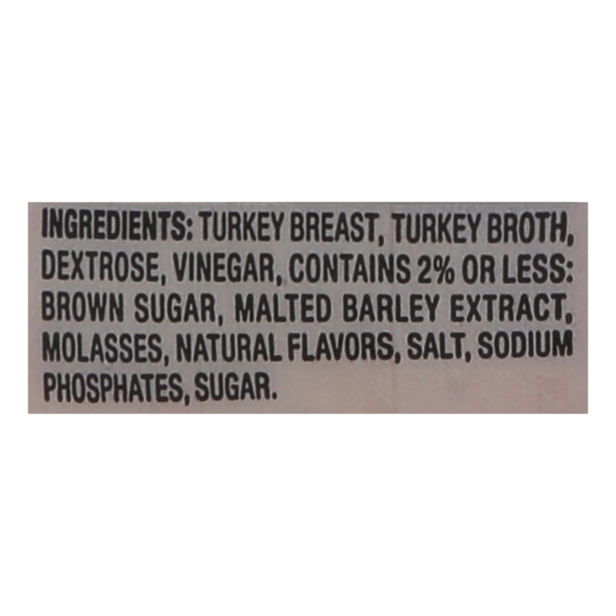 Turkey Breast, Turkey Broth, Dextrose, Vinegar, Contains 2% or Less: Brown Sugar, Malted Barley Extract, Molasses, Natural Flavors, Salt, Sodium Phosphates, Sugar.