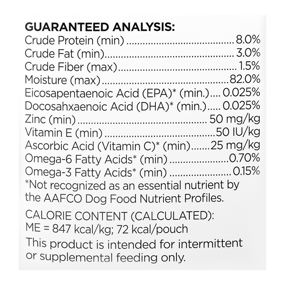 Calorie Content (Calculated): ME = 847 kcal/kg; 72 kcal/pouch. Designed to support healthy skin + coat. Savory meal enhancer for dogs. Grain free recipe. No corn, wheat, soy, rice, or added gluten. No…