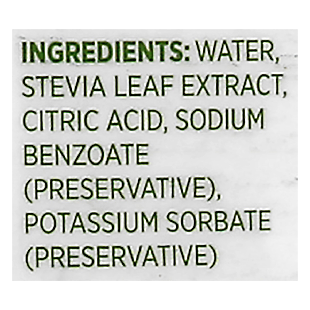 Water, Stevia Leaf Extract, Citric Acid, Sodium Benzoate (to Preserve Freshness), Potassium Sorbate, (to Preserve Freshness).