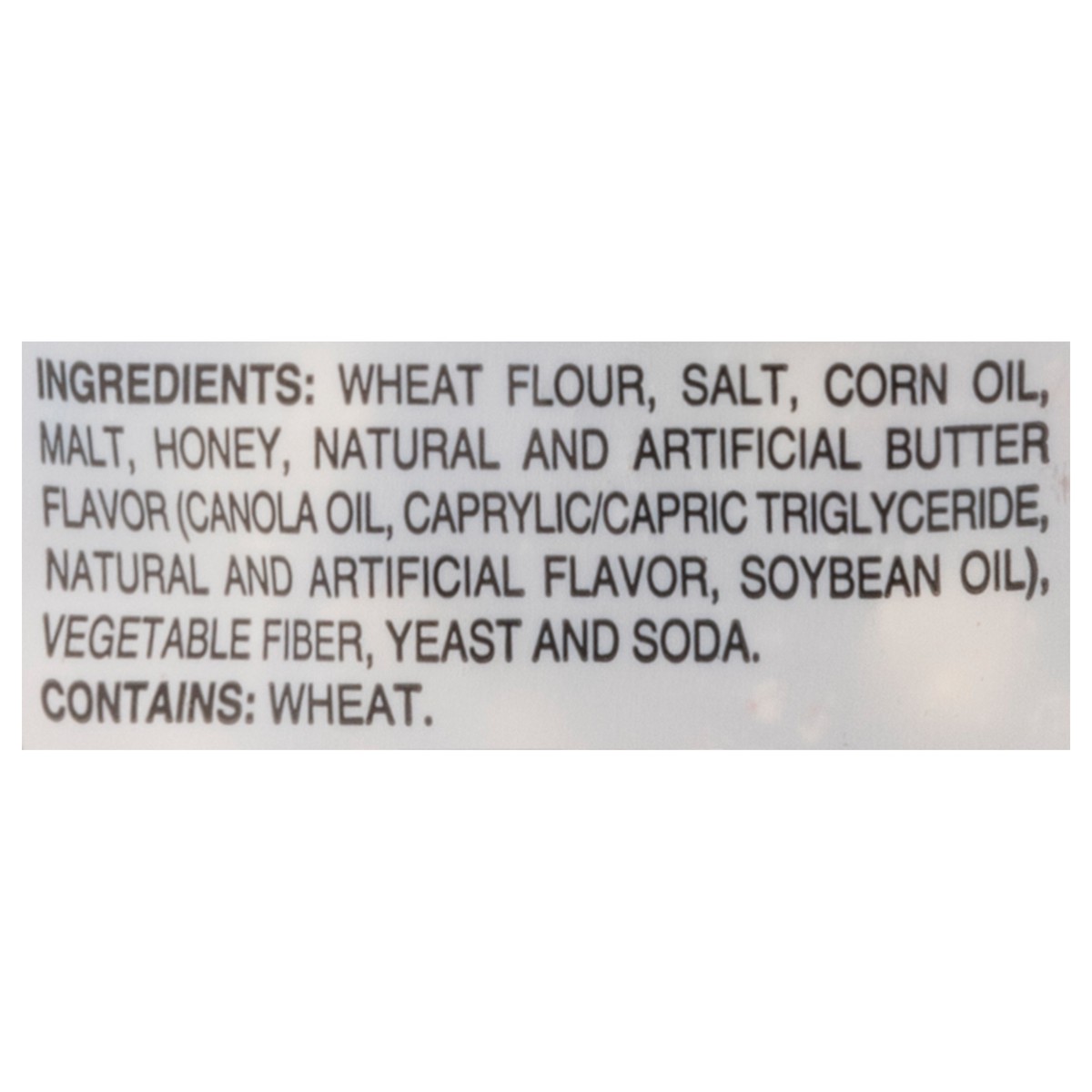 Wheat Flour, Salt, Corn Oil, Malt, Honey, Natural and Artificial Butter Flavor (Canola Oil, Caprylic/Capric Triglyceride, Natural and Artificial Flavor, Soybean Oil), Vegetable Fiber, Yeast and Soda.