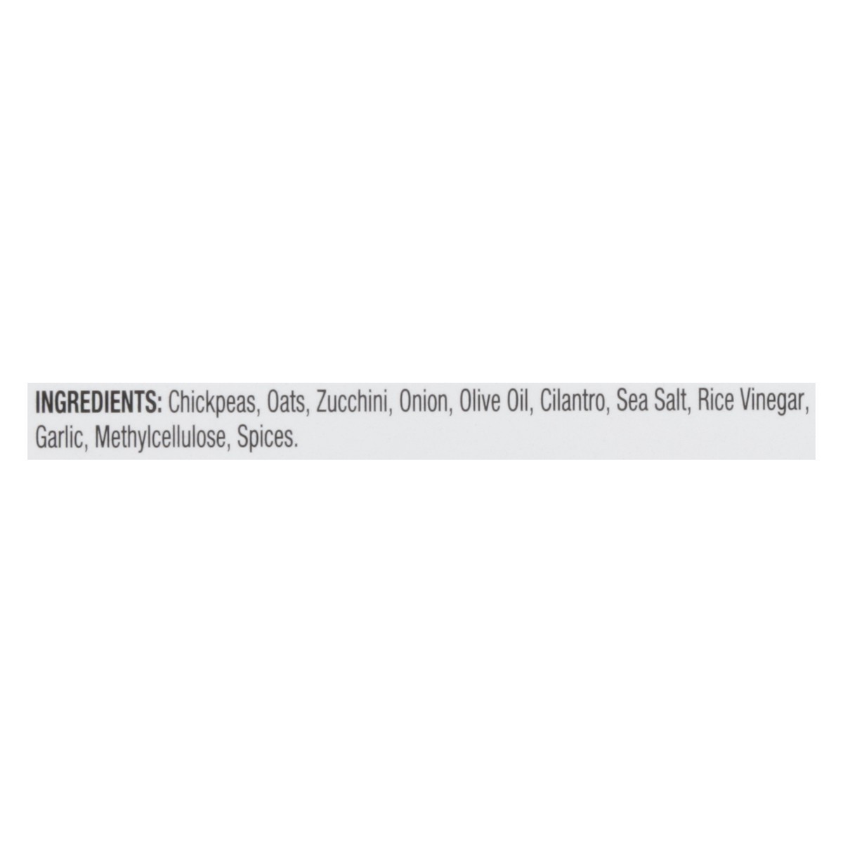 Chickpeas, Oats, Zucchini, Onion, Olive Oil, Cilantro, Sea Salt, Rice Vinegar, Garlic, Methylcellulose, Spices.