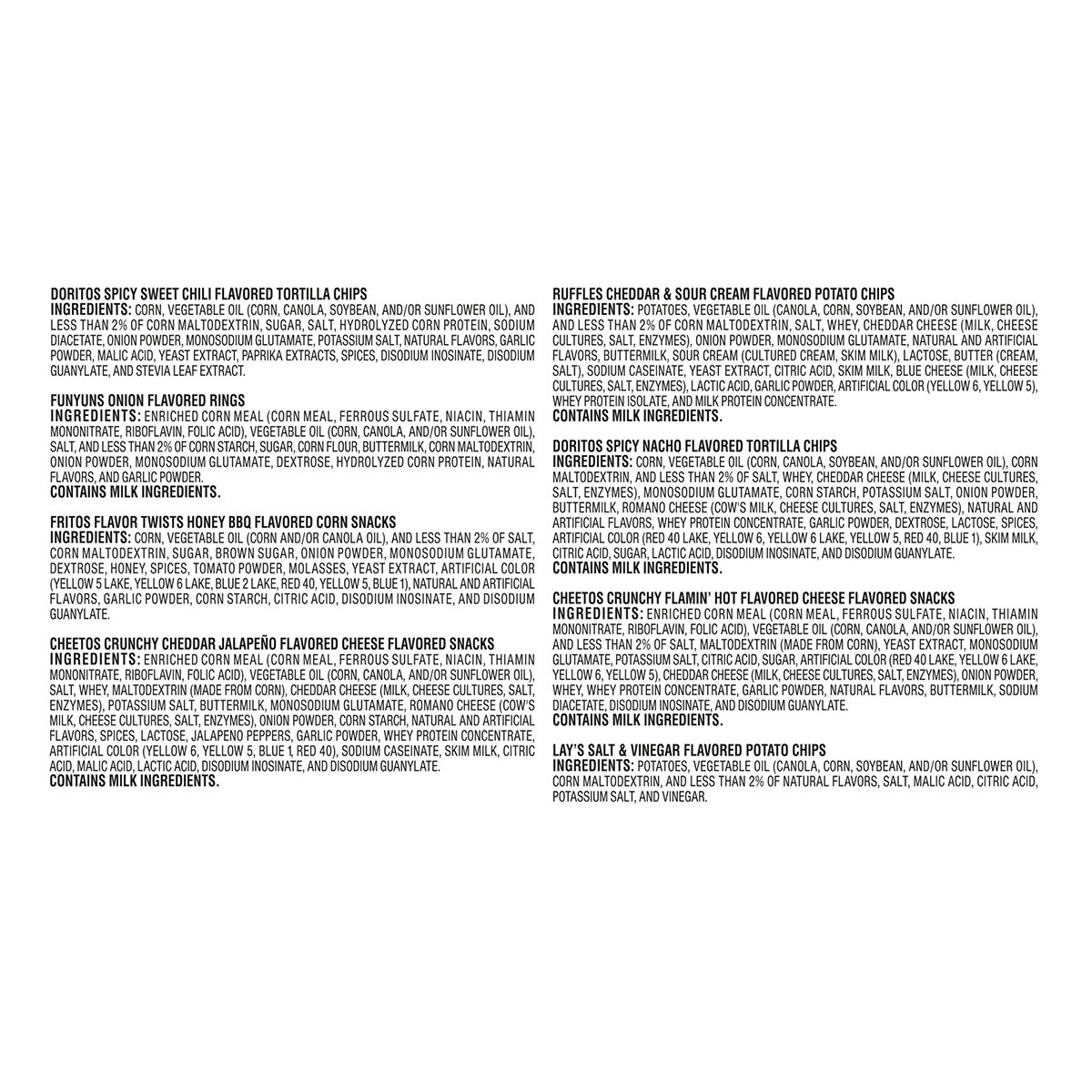 Doritos spicy sweet chili flavored tortilla chips : contains soy and wheat ingredients. funyuns onion flavored rings : contains milk ingredients. cheetos crunchy cheddar jalapeno flavored cheese flavored snacks : contains milk ingredients. ruffles cheddar & sour cream flavored potato chips : contains milk ingredients. doritos spicy nacho flavored tortilla : contains milk ingredients. cheetos crunchy flamin' hot flavored cheese flavored snacks : contains milk ingredients.