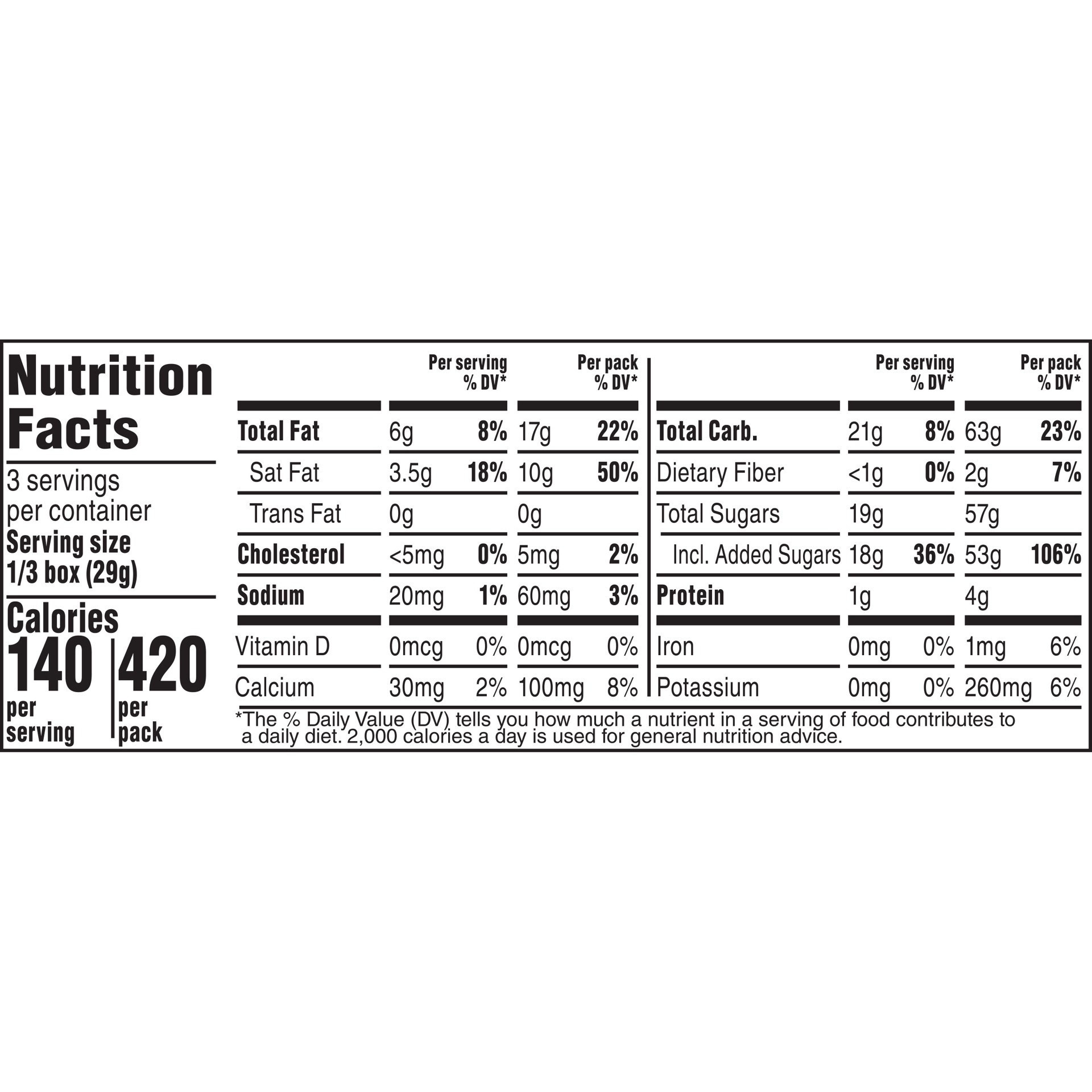 What's Inside (Per Serving (2 Servings Per Pack)): 210 calories (11% DV); 8 g total fat (12% DV); 5 g sat fat (25% DV); 29 g sugars (No DV defined); 30 mg sodium (1% DV). GDA's are based on a 2\,000 c…