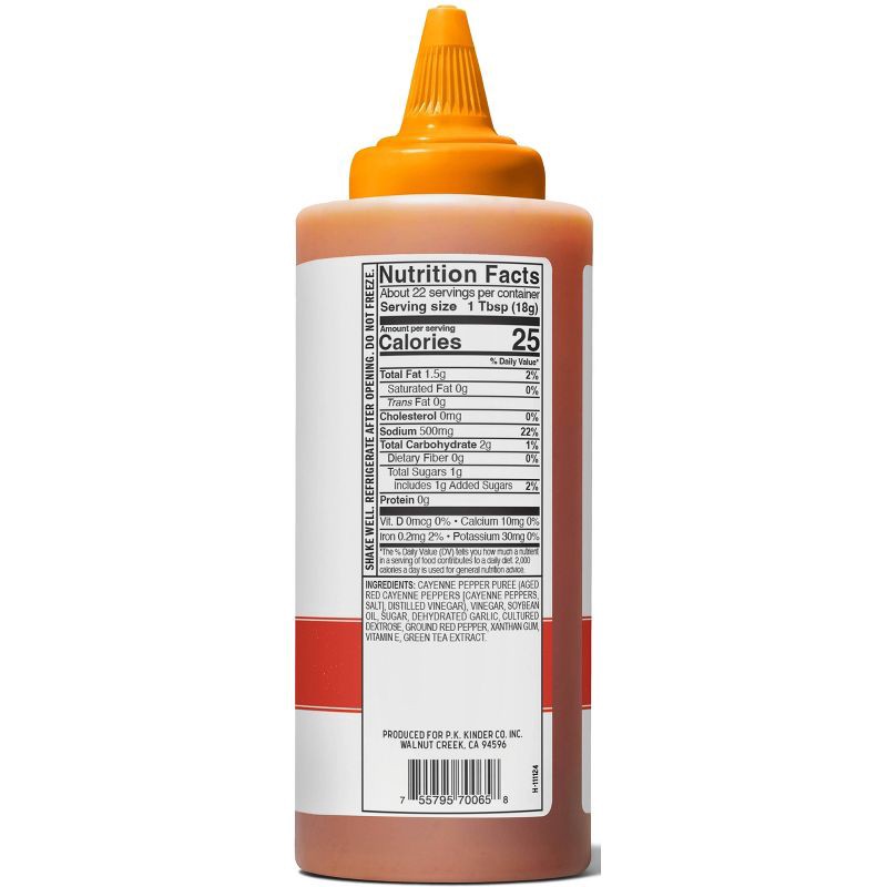 Cayenne Pepper Puree (Aged Red Cayenne Peppers [Cayenne Peppers, Salt], Distilled Vinegar), Vinegar, Soybean Oil, Sugar, Dehydrated Garlic, Cultured Dextrose, Ground Red Pepper, Xanthan Gum, Vitamin E…