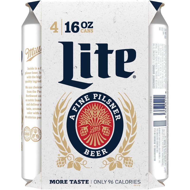 - You'll get four 16-ounce beer cans of Miller Lite American Light Lager Beer
