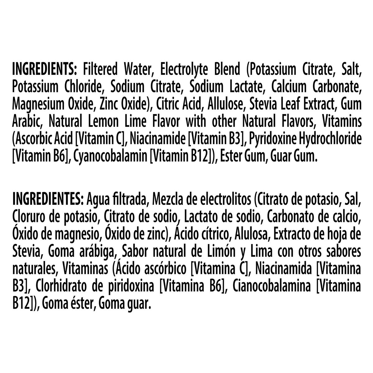 Filtered Water, Electrolyte Blend (Potassium Citrate, Salt, Potassium Chloride, Sodium Citrate, Sodium Lactate, Calcium Carbonate, Magnesium Oxide, Zinc Oxide), Citric Acid, Allulose, Stevia Leaf Extr…
