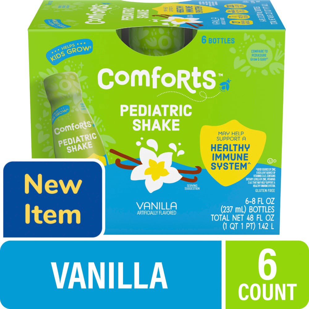 Comforts™ Vanilla Artificially Flavored Pediatric Shake offers 27 vitamins & minerals in each 8 fl oz bottle. With a tasty flavor, this pediatric shake may help support a healthy immune systemˆ. Inten…
