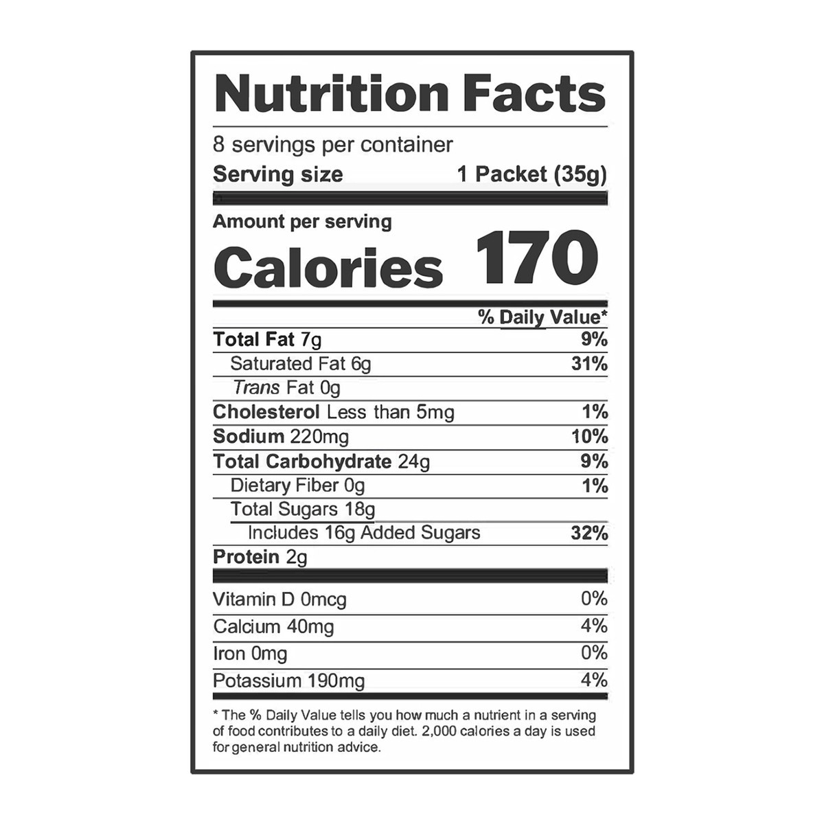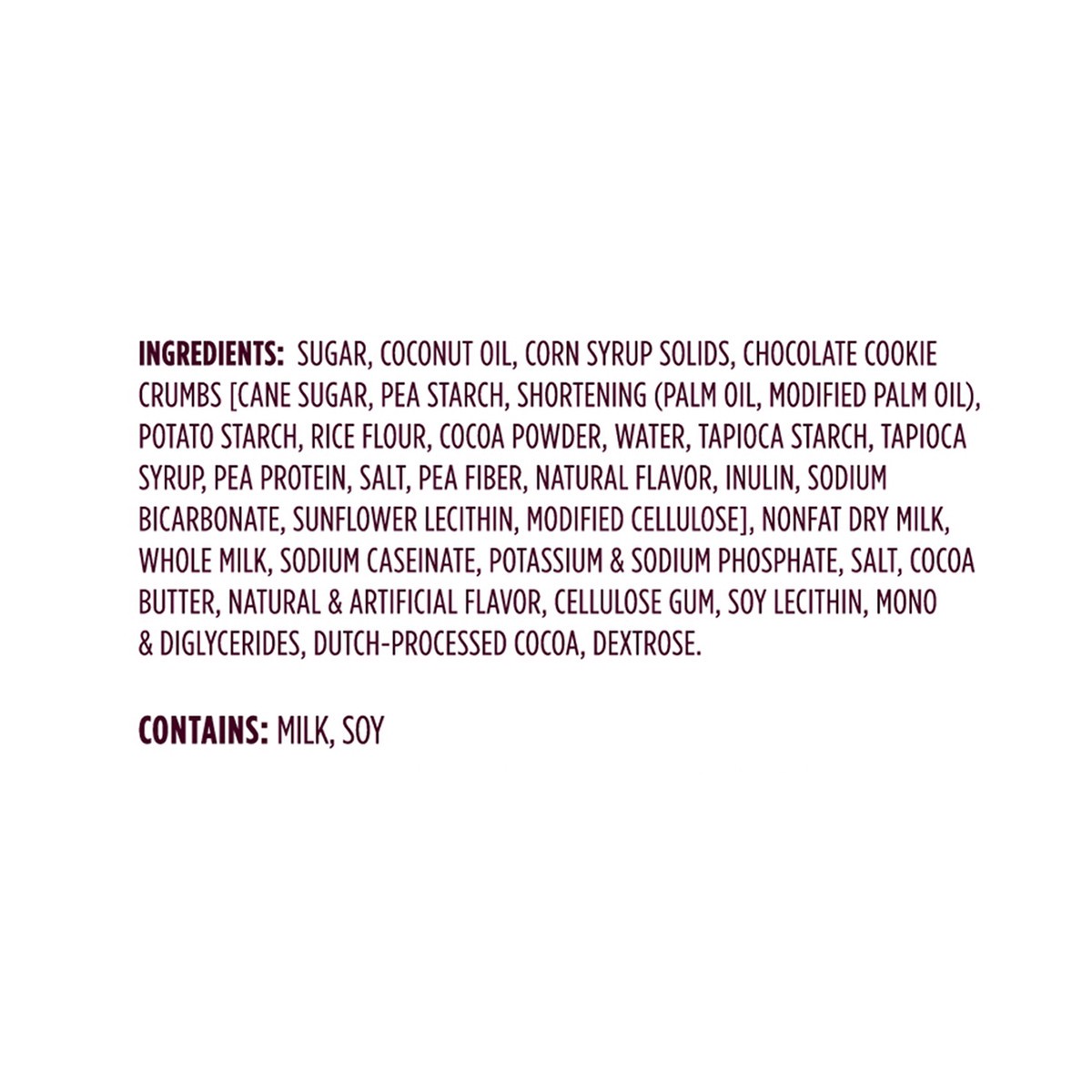 Sugar, Coconut Oil, Corn Syrup Solids, Chocolate Cookie Crumbs [Cane Sugar, Pea Starch, Shortening (Palm Oil, Modified Palm Oil), Potato Starch, Rice Flour, Cocoa Powder, Water, Tapioca Starch, Tapioc…