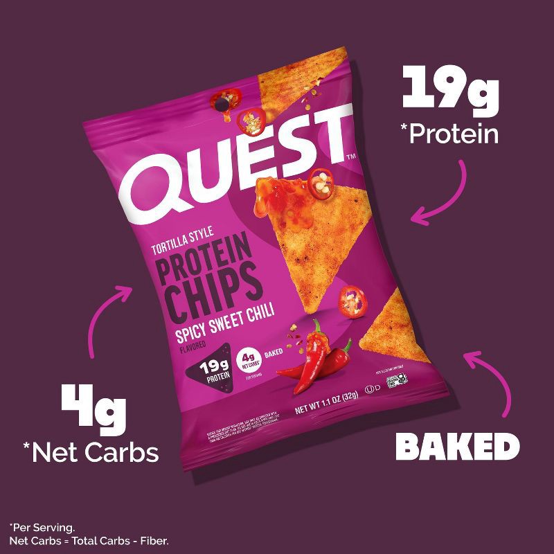 - ENJOY MORE. CARB LESS: The Quest Spicy Sweet Chili Tortilla Style Protein Chips provide all the crunch and satisfying taste of a regular tortilla chip; Only ours have 19g of protein and 4g net carbs per bag