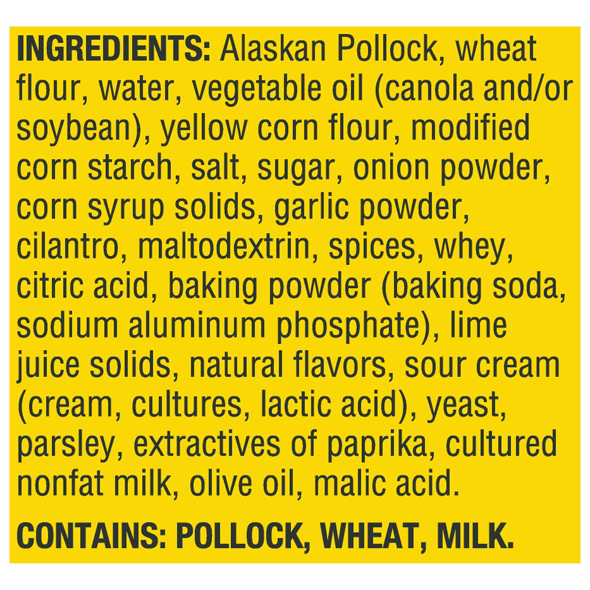 Alaskan Pollock, Wheat Flour, Water, Vegetable Oil (Canola and/or Soybean), Yellow Corn Flour, Modified Corn Starch, Salt, Sugar, Onion Powder, Corn Syrup Solids, Garlic Powder, Cilantro, Maltodextrin…
