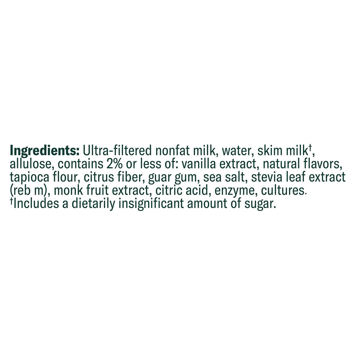 Ultra-Filtered Nonfat Milk, Water, Skim Milk (Includes a Dietarily Insignificant Amount of Sugar), Allulose, Contains 2% or Less of: Vanilla Extract, Natural Flavors, Tapioca Flour, Citrus Fiber, Guar…