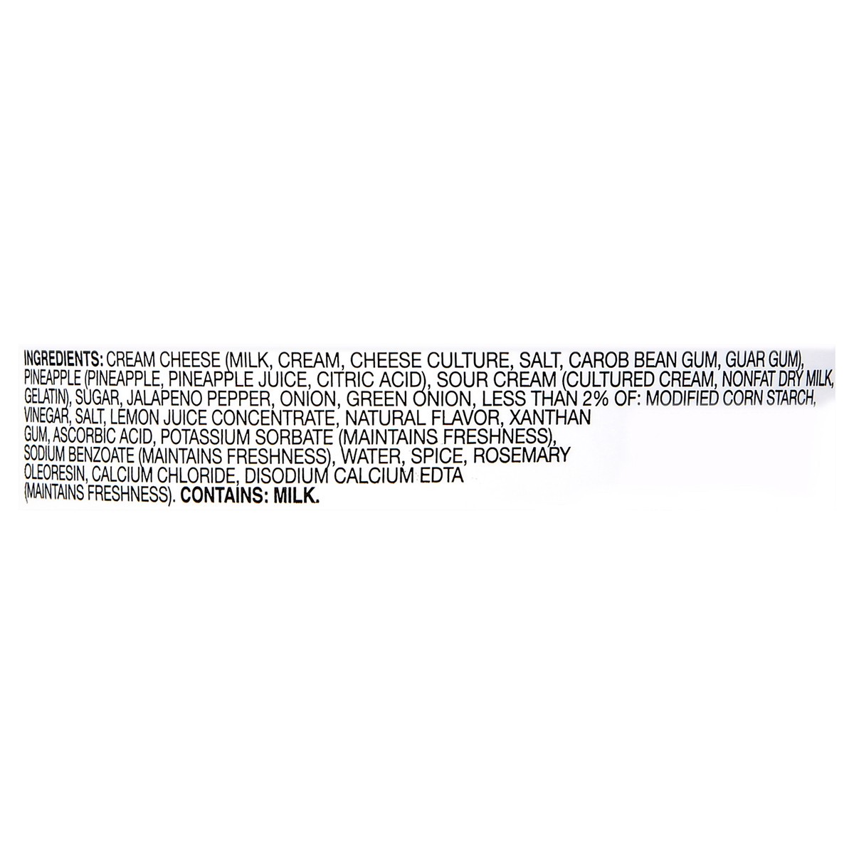 Cream Cheese (Milk, Cream, Cheese Culture, Salt, Carob Bean Gum, Guar Gum), Pineapple (Pineapple, Pineapple Juice, Citric Acid), Sour Cream (Cultured Cream, Nonfat Dry Milk, Gelatin), Sugar, Jalapeno …