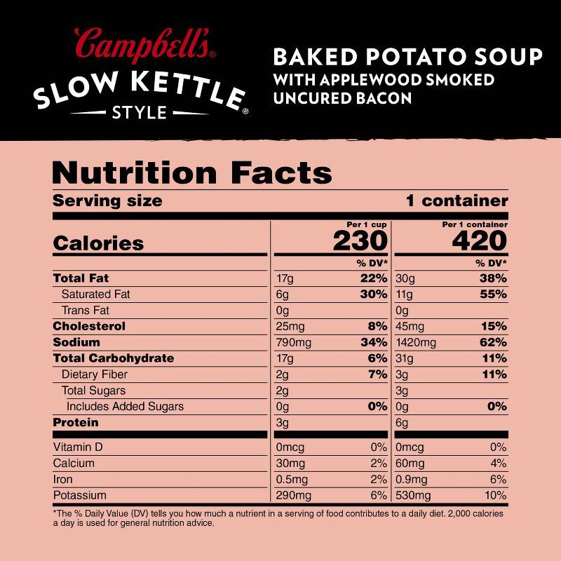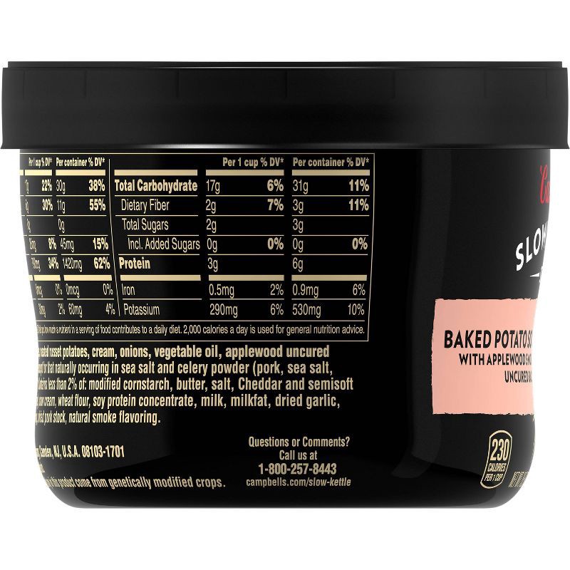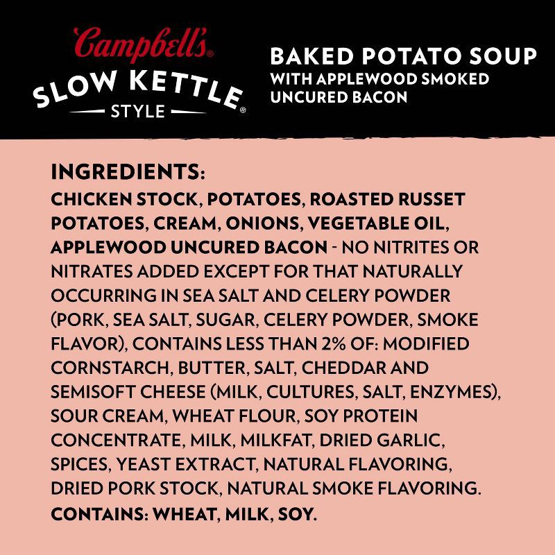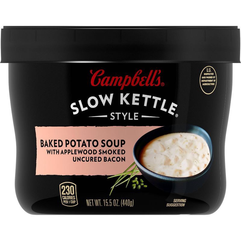 Carefully crafted by Campbell's chefs, Slow Kettle Style Baked Potato Soup with Applewood Smoked Uncured Bacon is a savory baked potato soup that's slow-cooked to perfection for rich flavor. Simmered …
