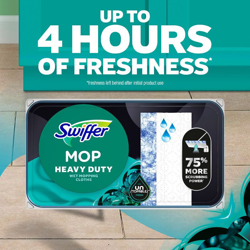 - Enjoy freshness for hours* with Swiffer Heavy Duty Mop Cloths with Unstopables Fresh Scent*Up to 4 hours of freshness left behind after initial product use