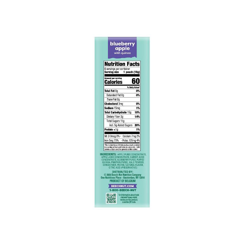 Blueberry Apple with Quinoa: Apple Puree Concentrate, Apple Juice Concentrate, Carrot Juice Concentrate, Blueberry Puree, Puffed Quinoa, Pumpkin Puree, Kale Powder, Citrus Fiber, Pectin, Natural Flavo…