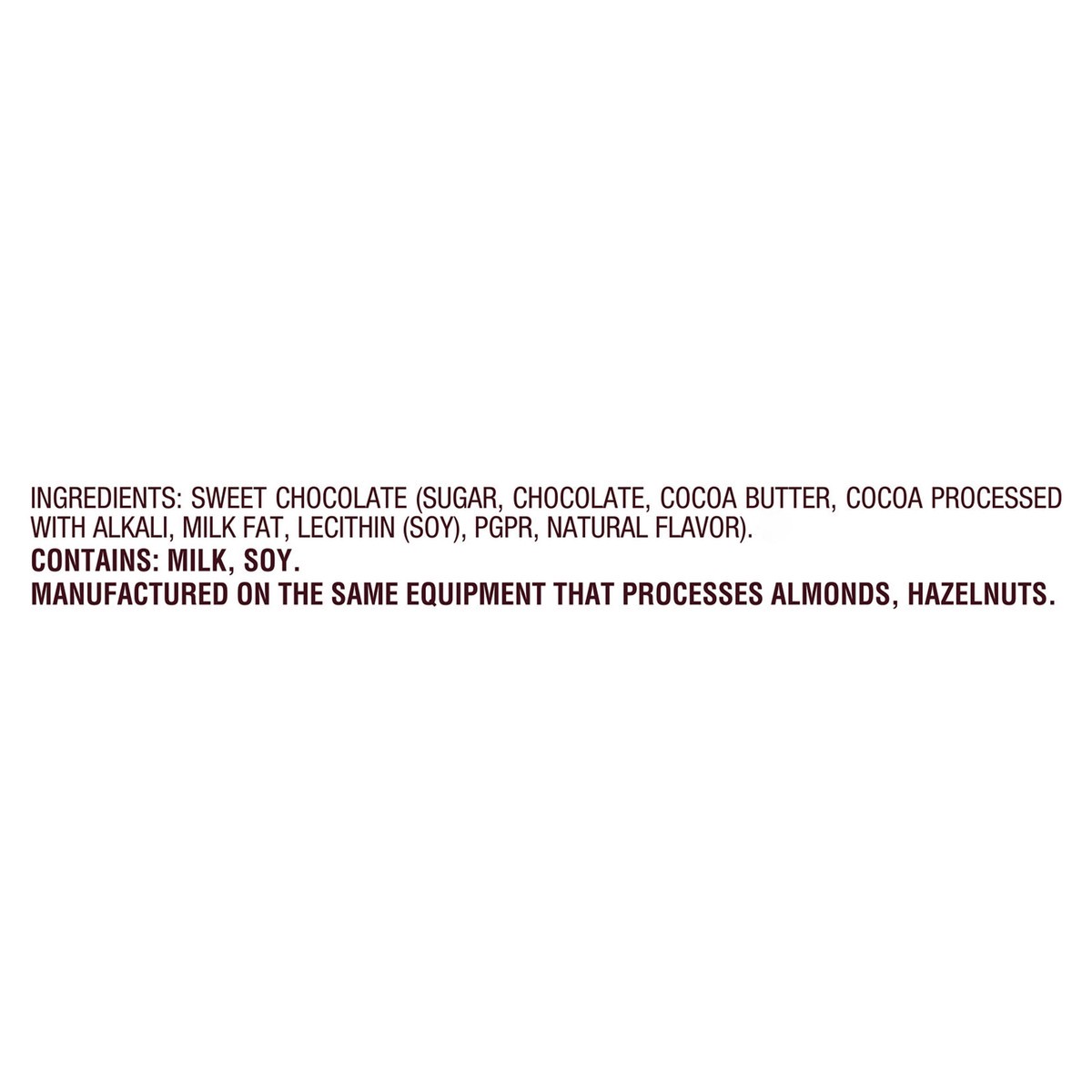 Sweet Chocolate (Sugar, Chocolate, Cocoa Butter, Cocoa Processed with Alkali, Milk Fat, Lecithin (Soy), PGPR, Natural Flavor).