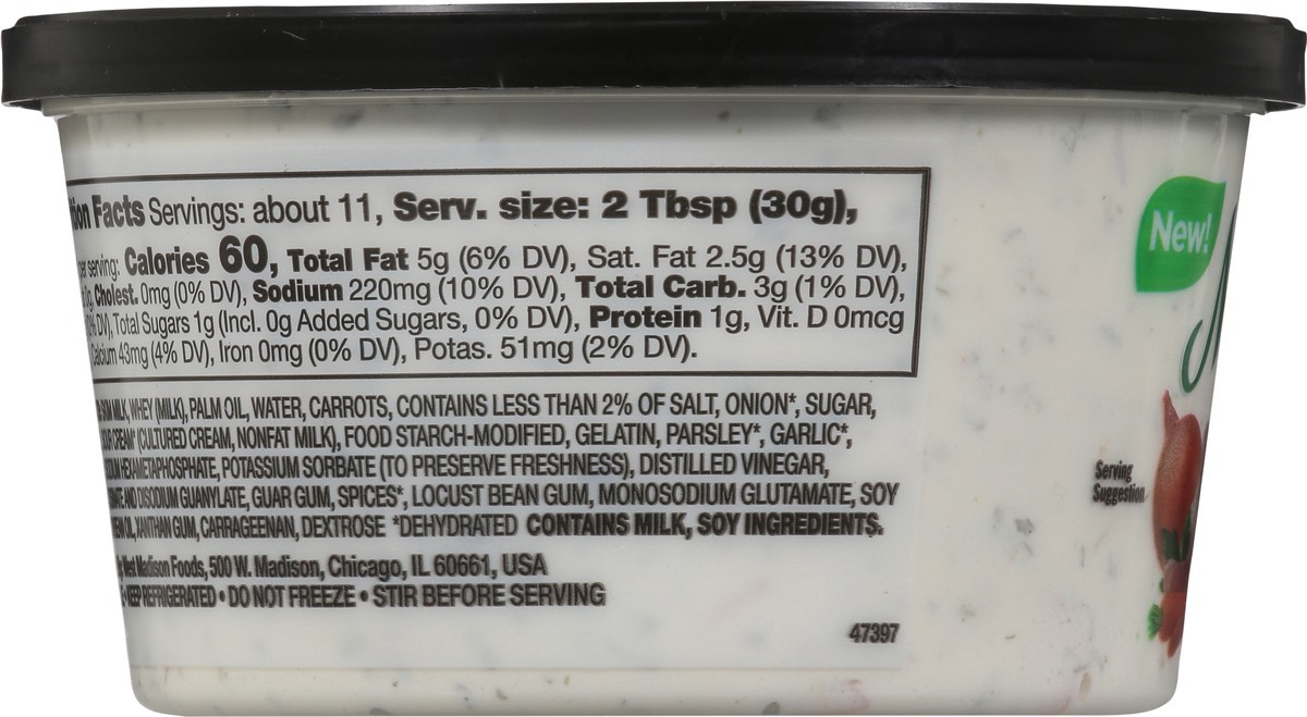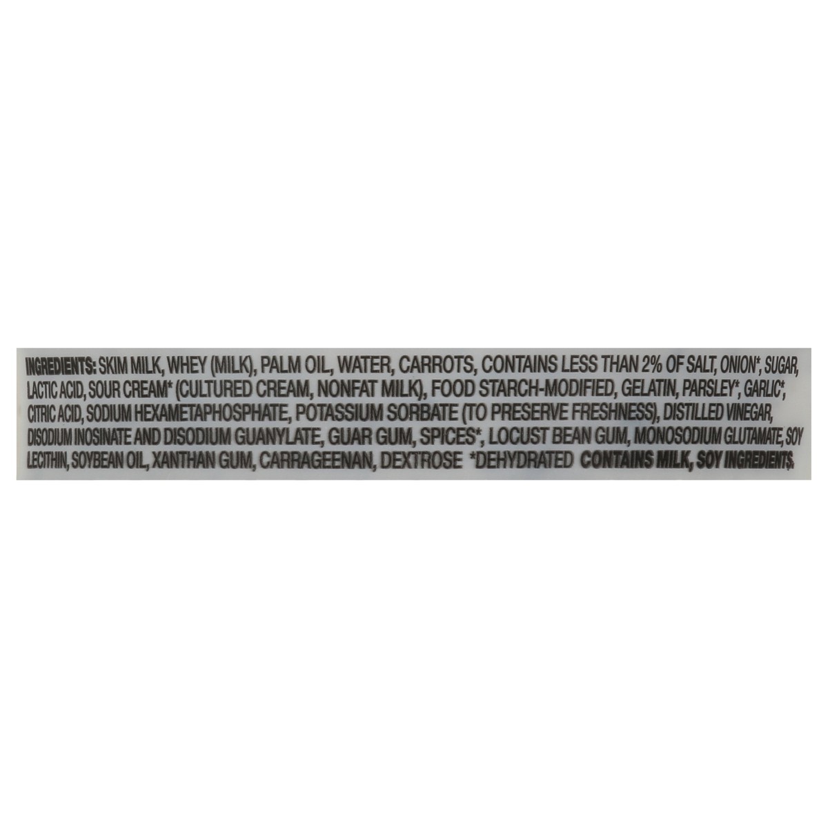 SKIM MILK, WHEY (MILK), PALM OIL, WATER, CARROTS, CONTAINS LESS THAN 2% OF SALT, ONION*, SUGAR, LACTIC ACID, SOUR CREAM* (CULTURED CREAM, NONFAT MILK), FOOD STARCH-MODIFIED, GELATIN, PARSLEY*, GARLIC*…