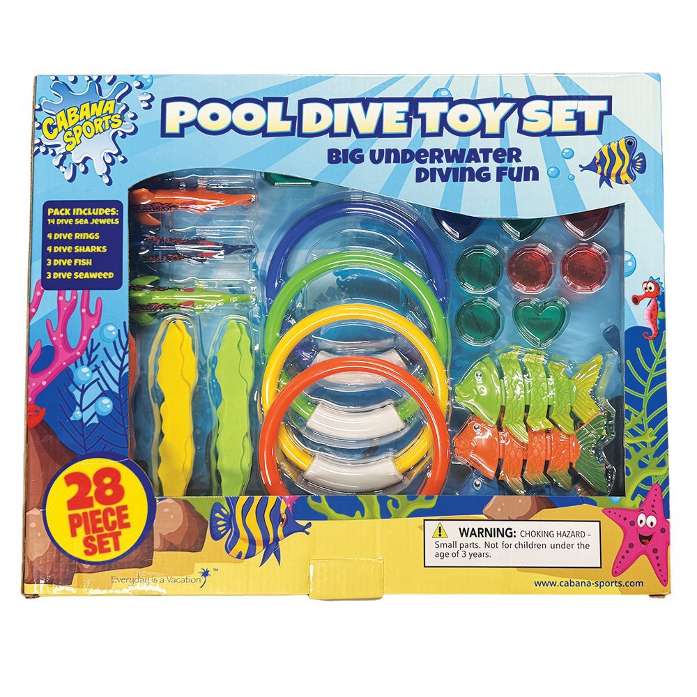 This 28 piece dive set is perfect for a variety of dive games and hours of fun. Simply throw the bright, easy to spot colored pieces into the pool and watch the weighted toys to sink to the bottom. Th…