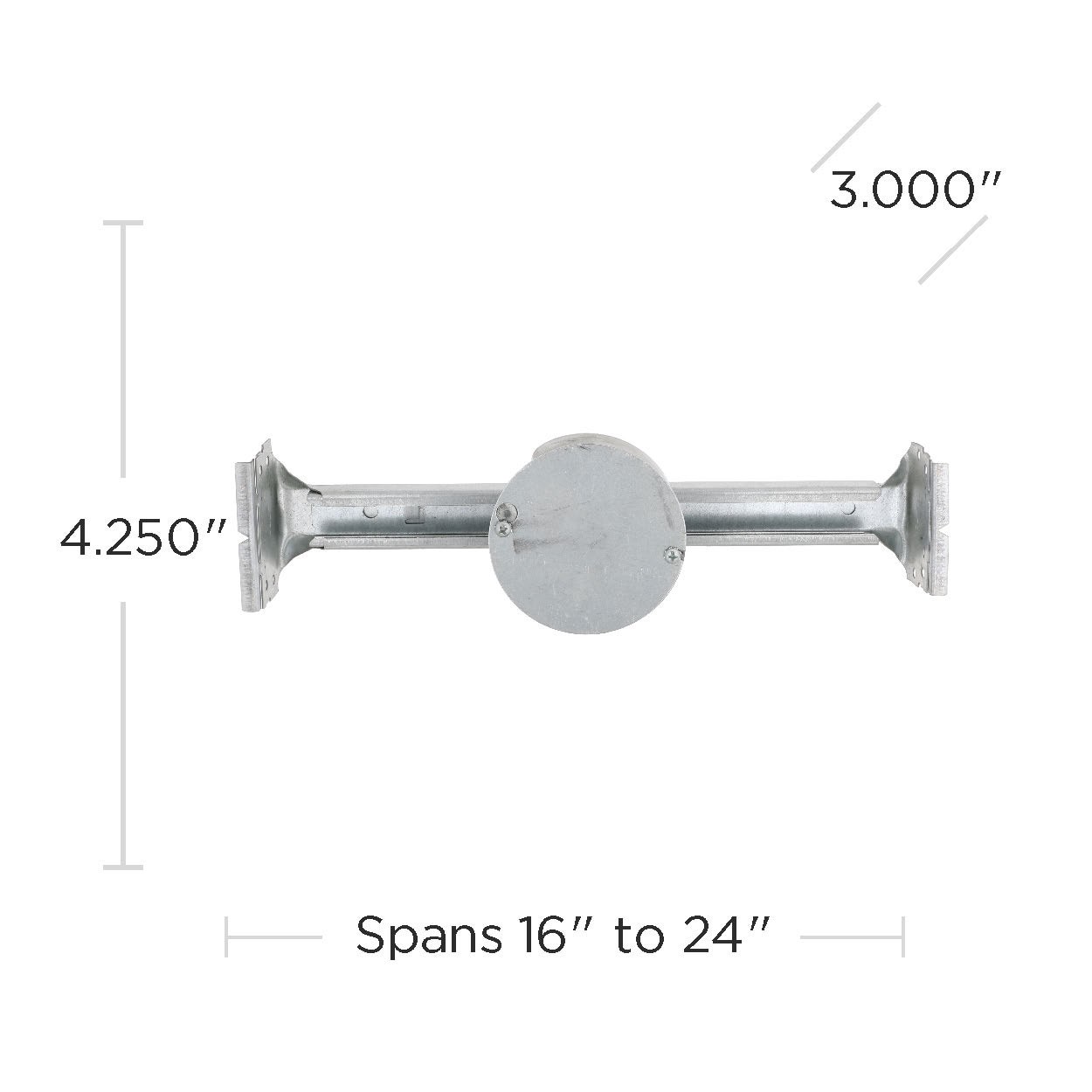 Two 1/2 in knockouts. 1-1/2 in depth. 16 in joist span, supports 70 lb ceiling fan. 24 in joist span, supports 70 lb ceiling fan. 16 in joist span, supports 210 lb light fixture. 24 in joist span, sup…