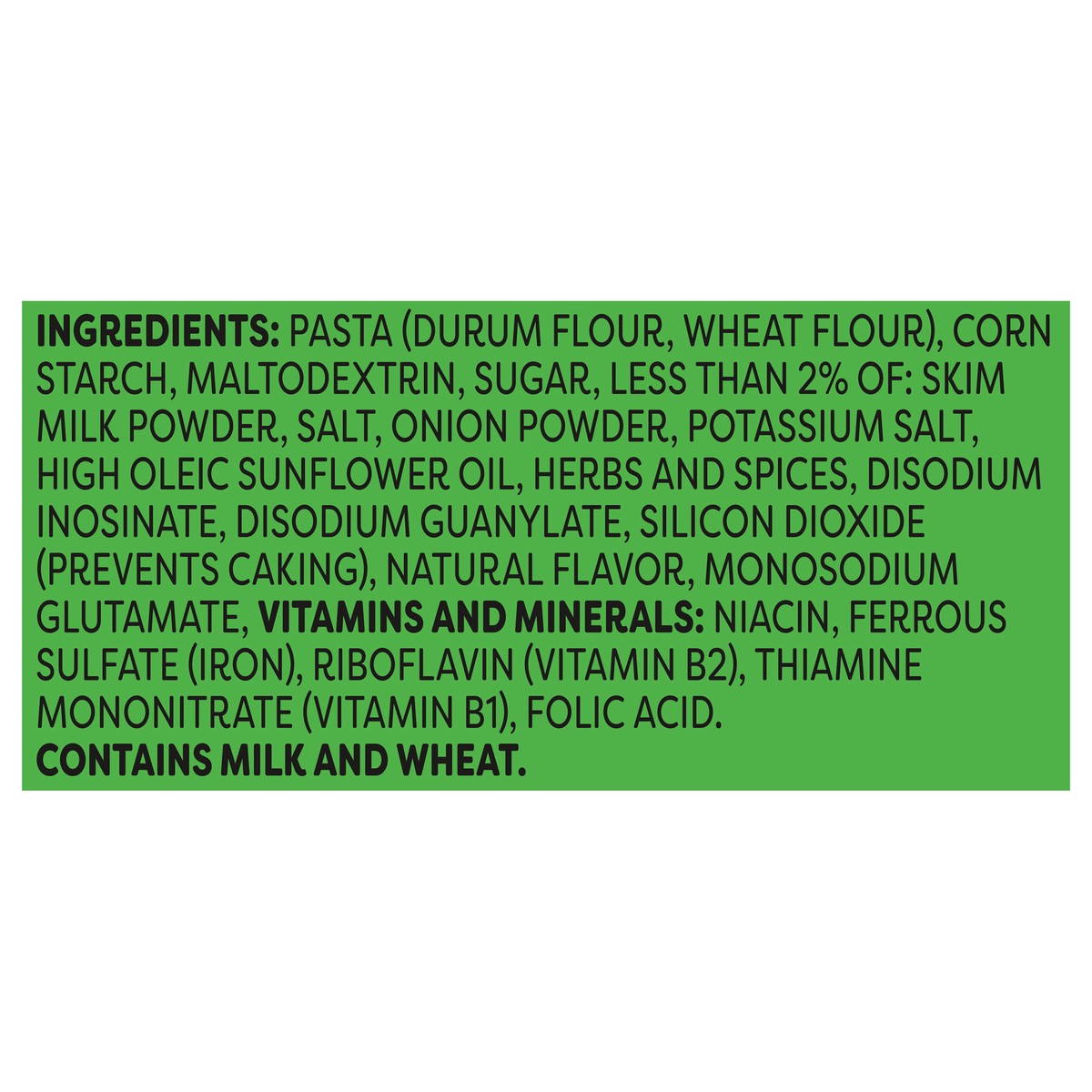 Pasta (Durum Flour, Wheat Flour), Corn Starch, Maltodextrin, Sugar, Less than 2% of: Skim Milk Powder, Salt, Onion Powder, Potassium Salt, High Oleic Sunflower Oil, Herbs and Spices, Disodium Inosinat…