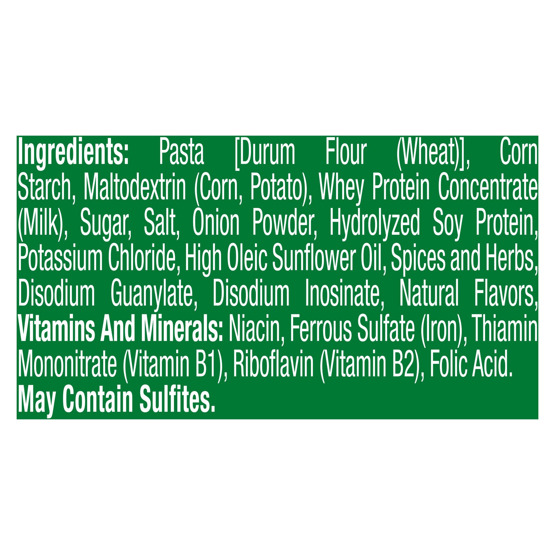 Pasta (Durum Flour, Wheat Flour), Corn Starch, Maltodextrin, Sugar, Less than 2% of: Skim Milk Powder, Salt, Onion Powder, Potassium Salt, High Oleic Sunflower Oil, Herbs and Spices, Disodium Inosinat…