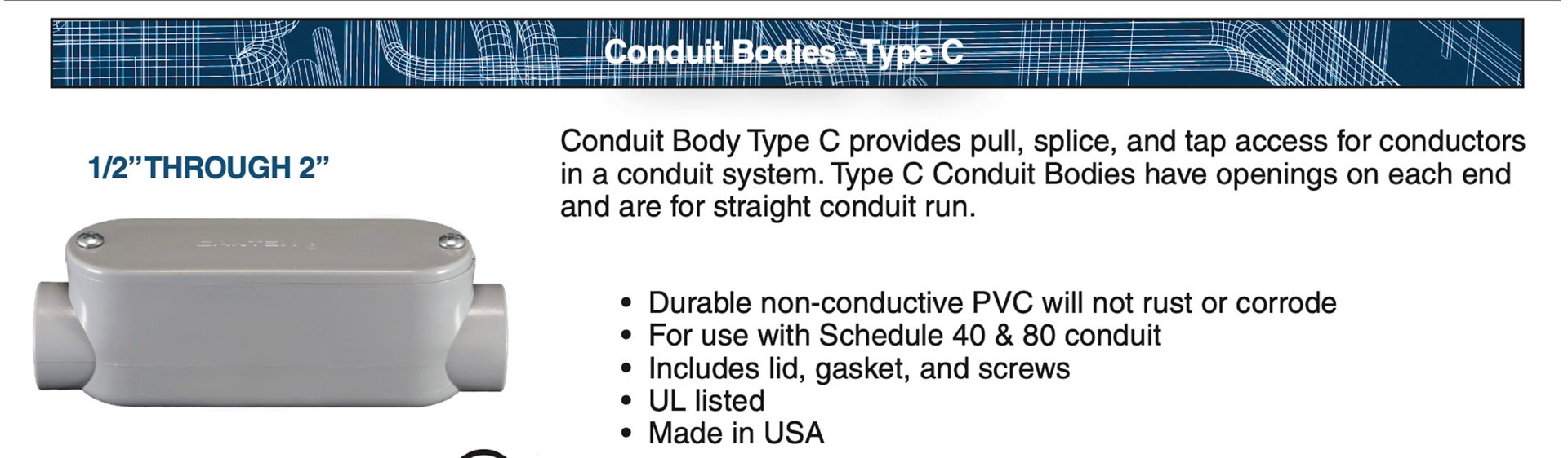 Type C conduit bodies have openings on each end and are for straight conduit runs. Durable non-conductive PVC will not rust or corrode. For used with schedule 40 and 80 conduit. Includes lid, gasket, …