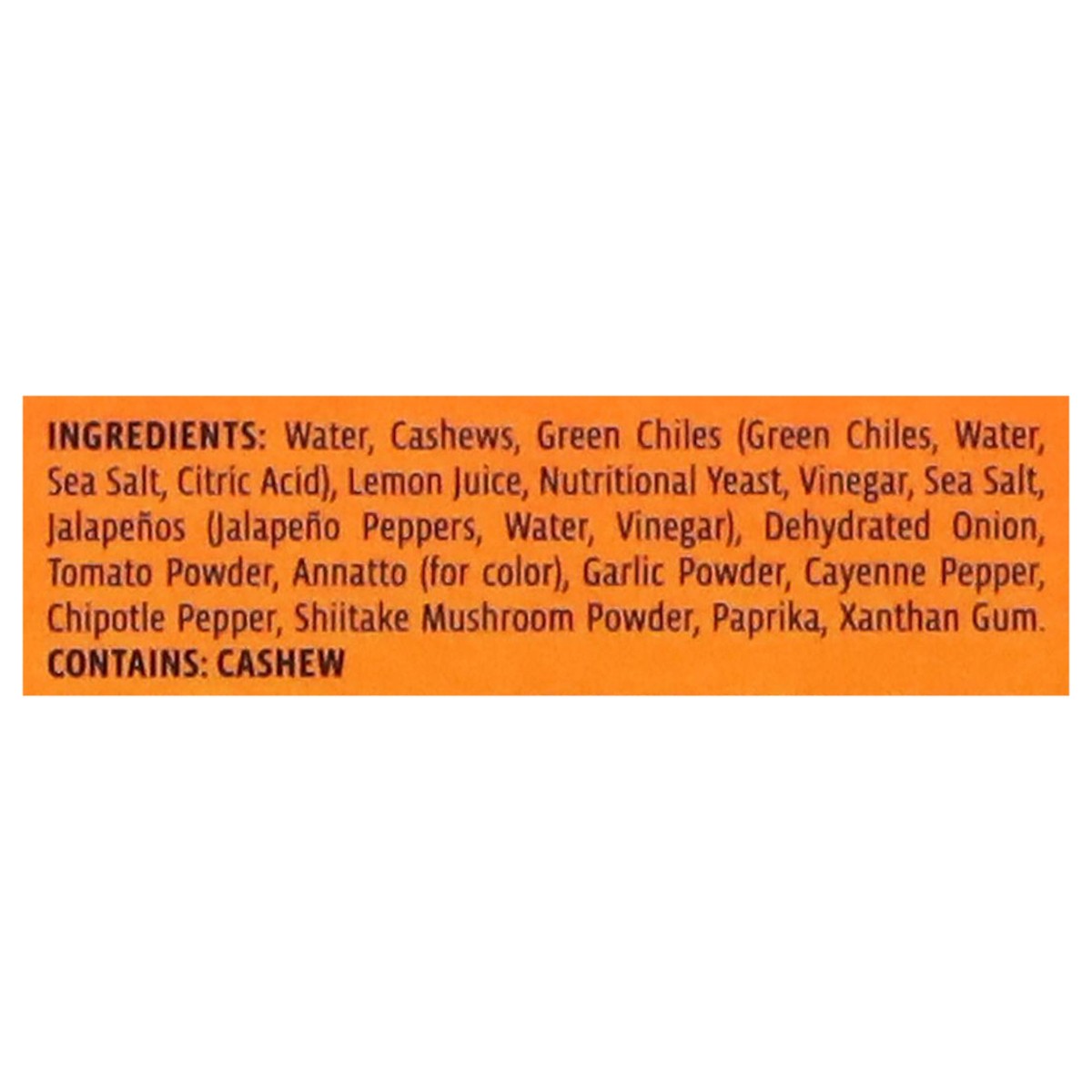 Water, Cashews, Green Chiles (Green Chiles, Water, Sea Salt, Citric Acid), Lemon Juice, Nutritional Yeast, Vinegar, Sea Salt, Jalapenos (Jalapeno Peppers, Water, Vinegar), Dehydrated Onion, Tomato Pow…