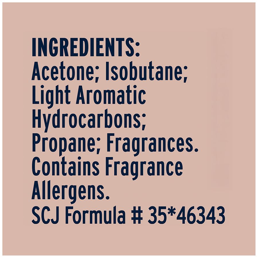 Isobutane; Distillates (petroleum), hydrotreated light; Acetone; Propane; Fragrance. Contains Fragrance Allergens. SCJ Formula # 35*14840.